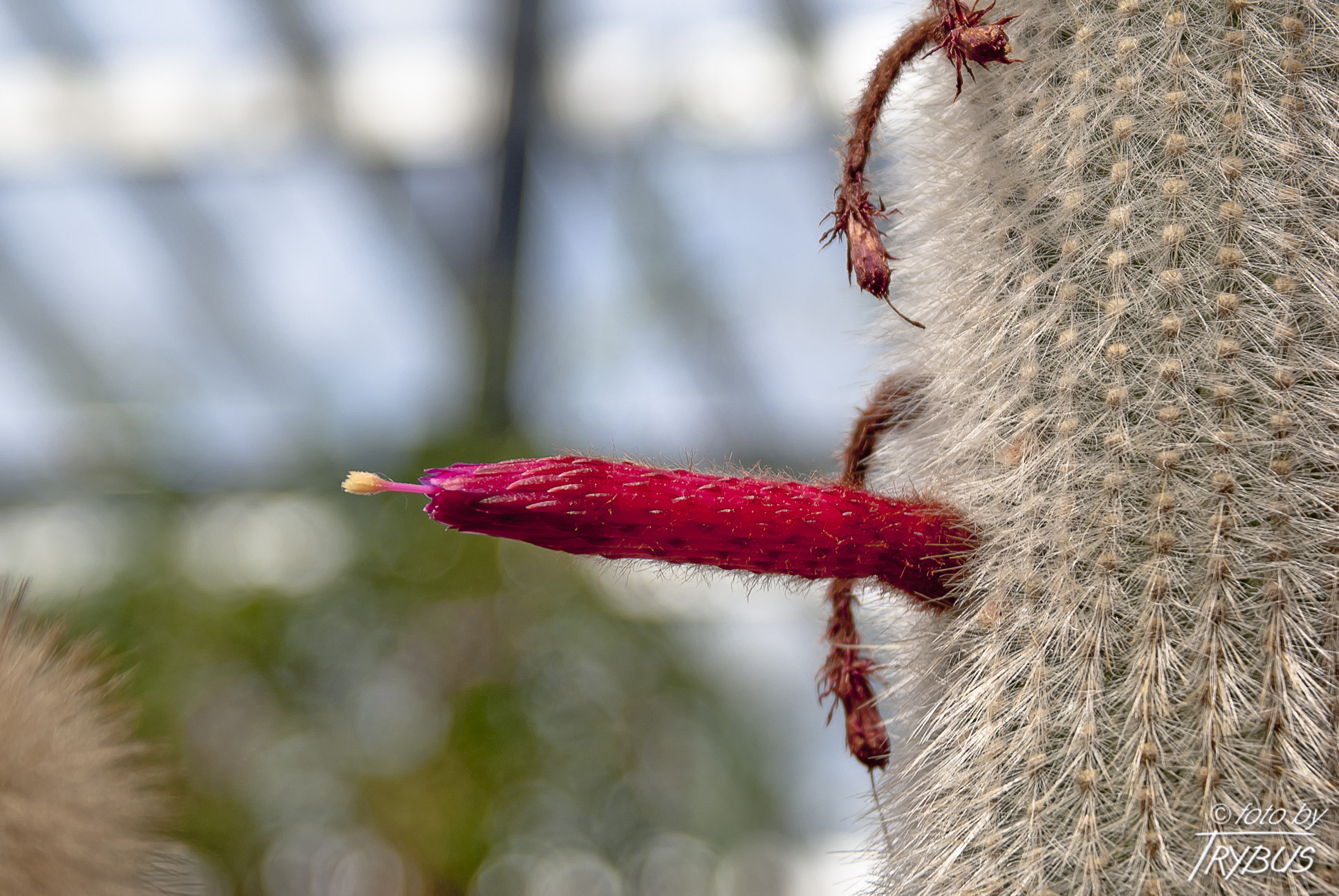 Kwiaty: Cleistocactus strausii jest rośliną silnie kwitnącą, a dojrzałe kaktusy (powyżej 50 cm wysokości) będą obficie wytwarzać ciemnofioletowo-czerwone rurkowate , lekko zakrzywione kwiaty. Kwiaty mają od 6 do 9 cm długości i wystają poziomo z łodygi po bokach w pobliżu końcówek. Podobnie jak w przypadku innych kaktusów z rodzaju klejstokaktusów, kwiaty prawie się nie otwierają, z wystającymi tylko znamionami i pręcikami. Tuba kwiatowa jest pokryta jedwabistym włosiem. Kwitnienie późnym latem. Rośliny uprawne często kwitną obficie.