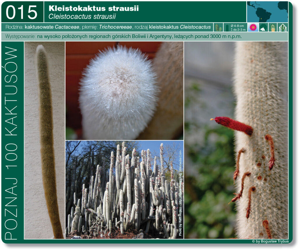 Cleistocactus strausii to łatwy w uprawie kaktus, nadający się do wiszących koszy i doniczek.
