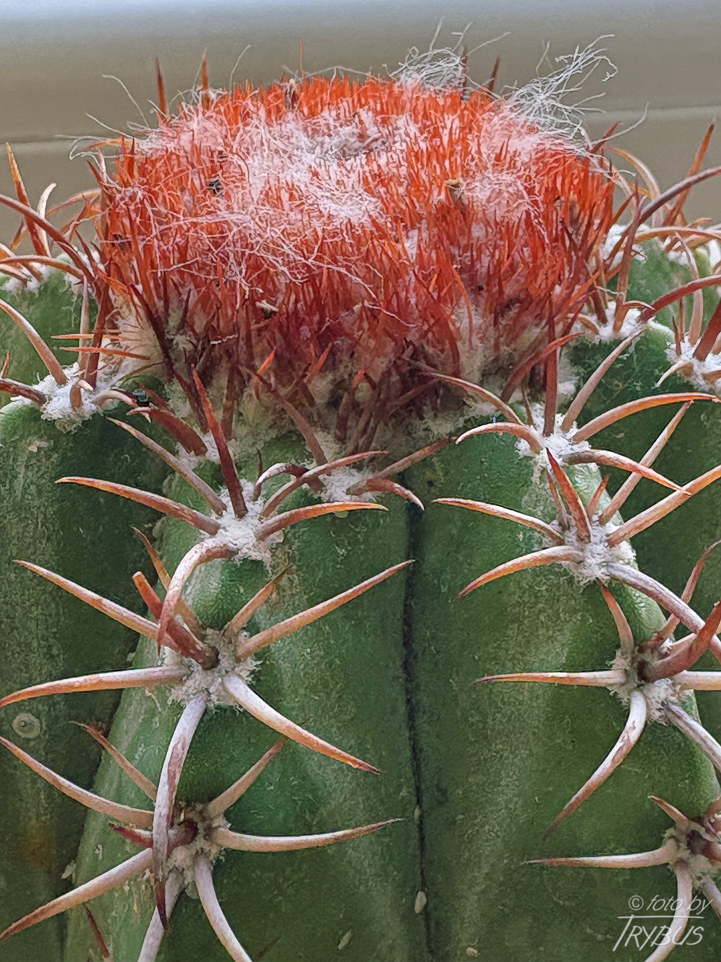 Cefalium jest gęsto pokryte czerwonobrązowym włosiem osiąga wysokość do 9 cm i średnicę od 5 do 6 cm.