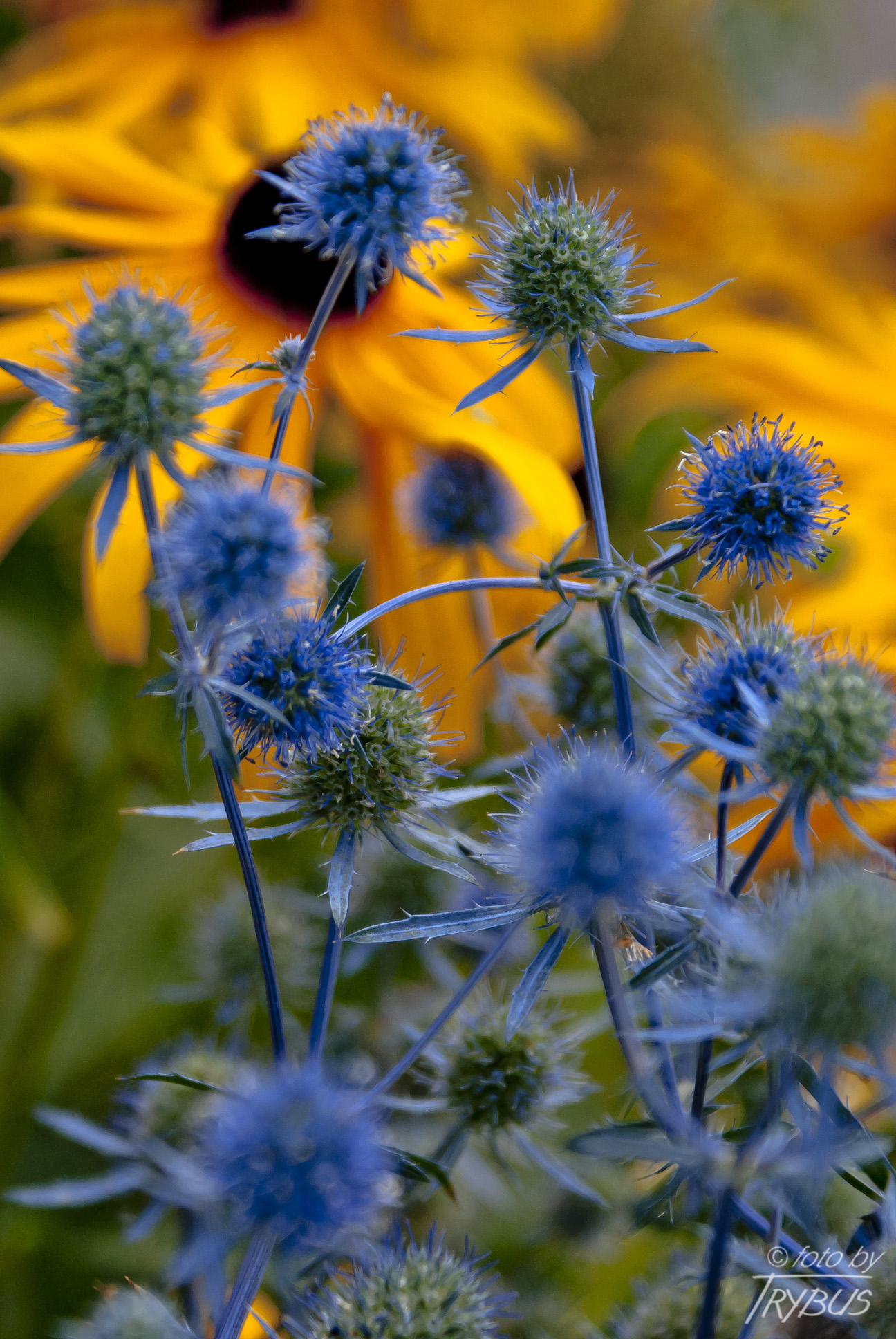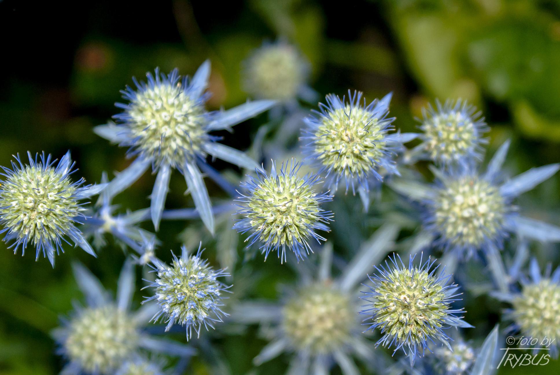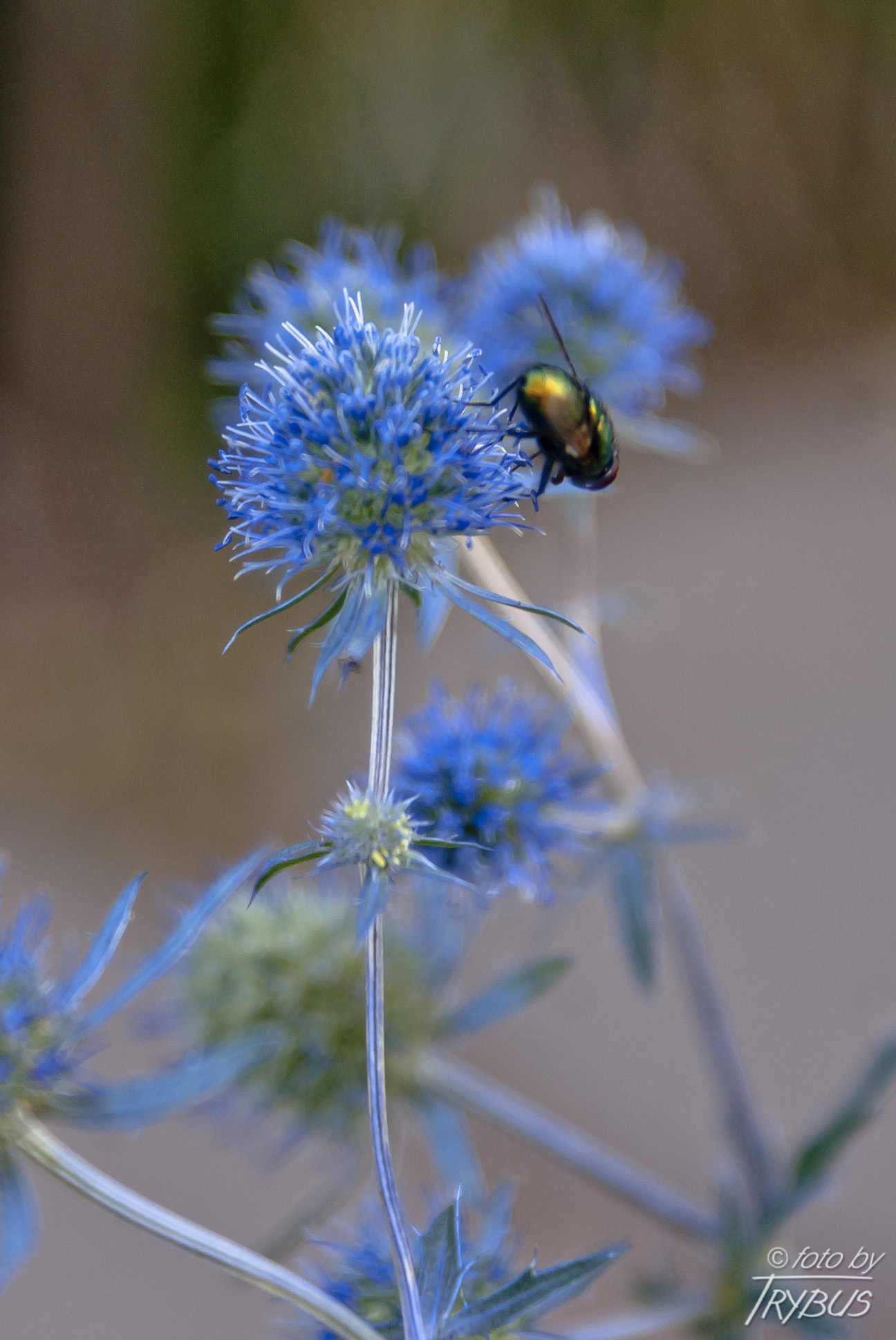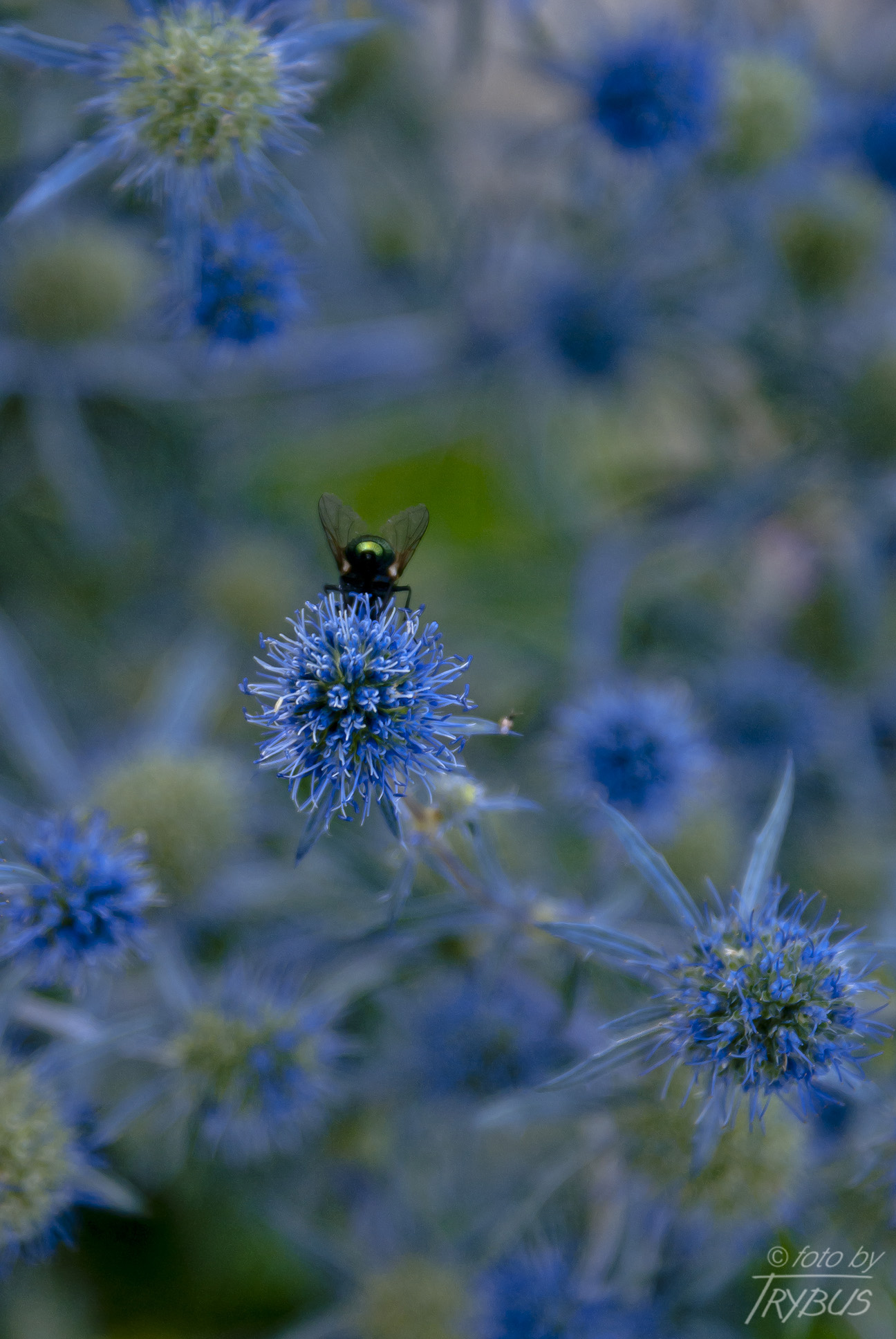 Kwiaty są niebieskie, zebrane w główki na szczytach pędów. Kwiaty owadopylne, zapylane przez trzmiele, pszczoły i motyle. Kwitną od lipca do września.