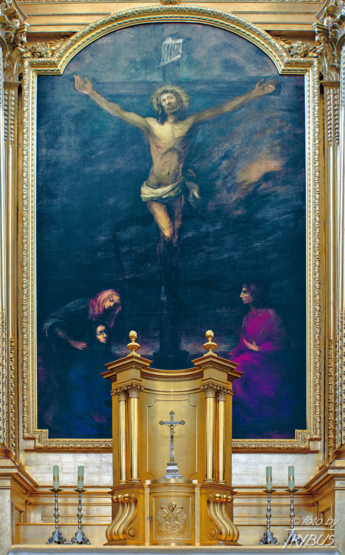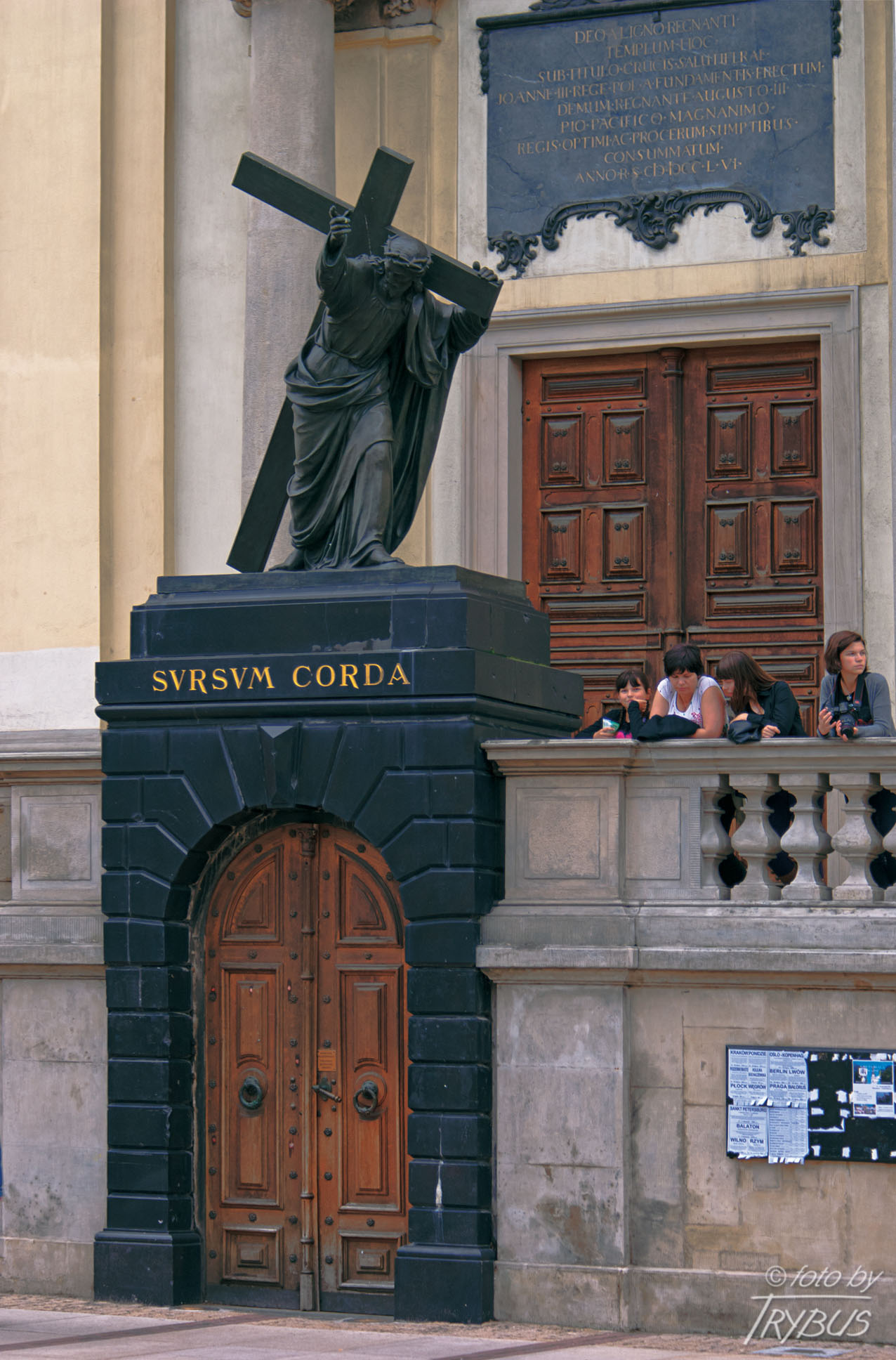 Przed kościołem, w 1858 roku stanęła figura Chrystusa dźwigającego krzyż, odlana w cemencie w warsztacie sztukatorskim Ferrante Marconiego według projektu Andrzeja Pruszyńskiego, a ufundowana przez hr. Andrzeja Zamoyskiego. Po kilku latach na rzeźbie pojawiły się pęknięcia, dlatego zdecydowano o wykonaniu odlewu z brązu. Figurę wiernie odtworzył w Rzymie w 1889 roku Pius Weloński. Pomnik ustawiono na nowym cokole z czarnego granitu, zaprojektowanym przez Stefana Szyllera, ze złoconym napisem Sursum Corda (w górę serca).