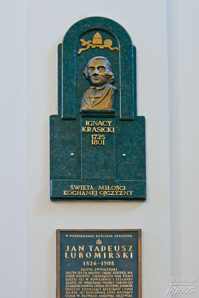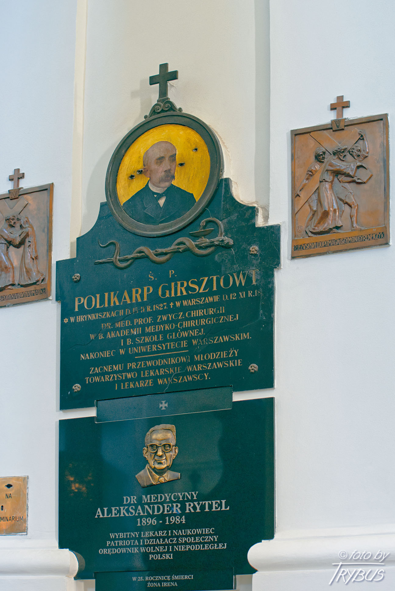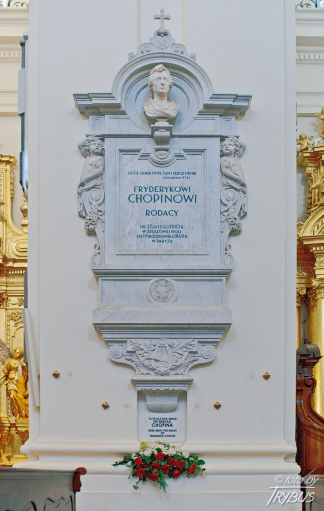 Na ścianach kościoła umieszczonych jest wiele epitafiów i tablic pamiątkowych poświęconych wybitnym przedstawicielom narodu polskiego. Godne uwagi są szczególnie dwa epitafia, w które wmurowane zostały serca zmarłych: Fryderyka Chopina (zm. 1849), wybitnego kompozytora i pianisty oraz Władysława Reymonta (zm. 1925), polskiego pisarza i noblisty. Swoje epitafia w kościele mają też: Bolesław Prus, Józefa Ignacy Kraszewski, Juliusz Słowacki, Adam Mickiewicz oraz gen. Władysław Sikorski. W dolnym kościele pochowany został m.in. Stanisław Małachowski (zm. 1809), marszałek Sejmu Wielkiego.
