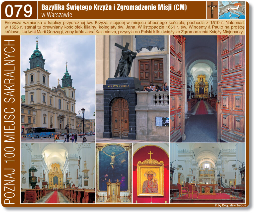 Bazylika Świętego Krzyża w Warszawie jest monumentalną, barokową świątynią, górującą dwiema wysokimi wieżami nad Krakowskim Przedmieściem. Choć nie jest katedrą, działy się w nim i dzieją wydarzenia przerastające swoją doniosłością niejedną katedrę. Bóg i Ojczyzna, hasło rozbrzmiewające w jego murach od wieków, zdaje się witać każdego wchodzącego. Kościół brał udział w niejednej burzy dziejowej i był świadkiem wielkich wydarzeń historycznych w życiu stolicy i kraju. W tym kościele spoczywają prochy nie tylko zasłużonych misjonarzy, takich jak: Lambert aux Couteaux, Bartłomiej Tarło czy Gabriel Baudouin. Leżą tu między innymi Adam Kazimierz Czartoryski i Stanisław Małachowski. Przez trzy lata w dolnym kościele stała trumna ze zwłokami księcia Józefa Poniatowskiego, zanim została przewieziona do Krakowa i złożona na Wawelu. Znajdują się też tutaj serca Fryderyka Chopina i Władysława Reymonta. Stąd żegnano przed ostatnią drogą Stanisława Kostkę Potockiego, Edwarda Odyńca, Stanisława Moniuszkę, Karola Szymanowskiego, Pawła Jasienicę i wielu innych. W kościele Świętego Krzyża modlili się królowie, prezydenci, kardynałowie i dowódcy. Tu w 1683 król Jan III Sobieski zawierzył Bogu siebie i Ojczyznę przed wyprawą na Wiedeń. Tutaj modlił się nuncjusz apostolski Achilles Ratti, późniejszy papież Pius XI, a później w 1987 roku sam Ojciec Święty Jan Paweł II. W 1704 roku z inicjatywy ówczesnego proboszcza parafii Michała Bartłomieja Tarły i Bractwa św. Rocha, działającego przy kościele od 1688 roku, po raz pierwszy w Polsce zostało odprawione tutaj nabożeństwo Gorzkich żali. Od czasów króla Stanisława Augusta Poniatowskiego kościół ten stał się świątynią o charakterze ogólnopolskim ze względu na odbywające się w nim uroczyste nabożeństwa i manifestacje patriotyczne, zarówno za czasów rosyjskiej, carskiej niewoli, jak i podczas pięćdziesięciolecia po II wojnie światowej. Był też oazą patriotyzmu i oparciem dla wielu prześladowanych w okresie powstań narodowych i tworzenia się ruchu solidarnościowego.