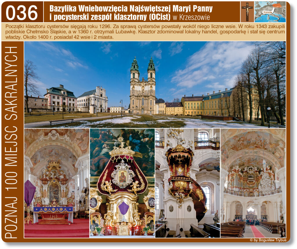 Pocysterskie opactwo w Krzeszowie – kompleks najwyższej światowej klasy zabytków, którego początki sięgają XIII wieku. Opactwo nazywane „europejską perłą baroku”. Cały kompleks składa się z: kościoła klasztornego wraz z Mauzoleum Piastów Śląskich, klasztoru, ogrodu, Kalwarii Krzeszowskiej, kościoła bractwa św. Józefa, domu gościnnego opata oraz budynków pomocniczych. Obecnie pieczę nad całością mają siostry benedyktynki, które przybyły ze Lwowa.