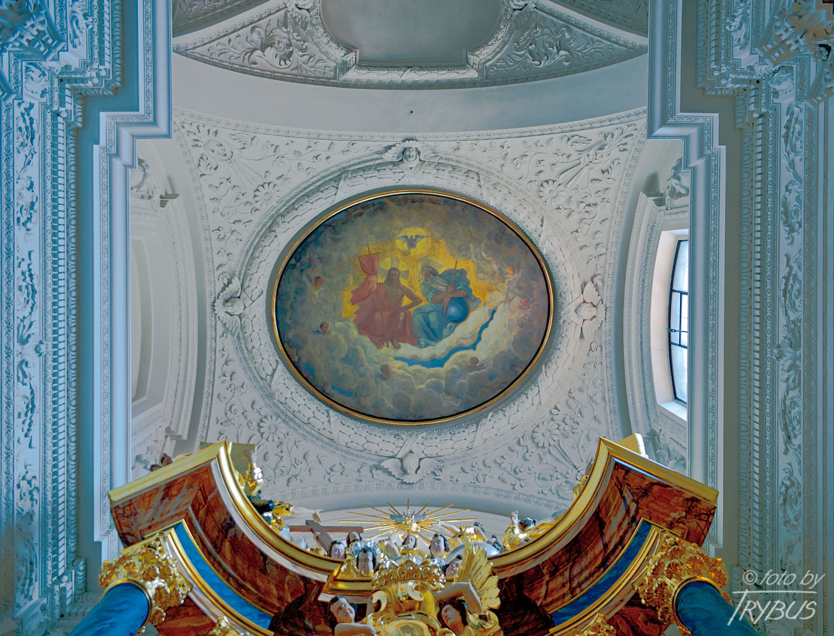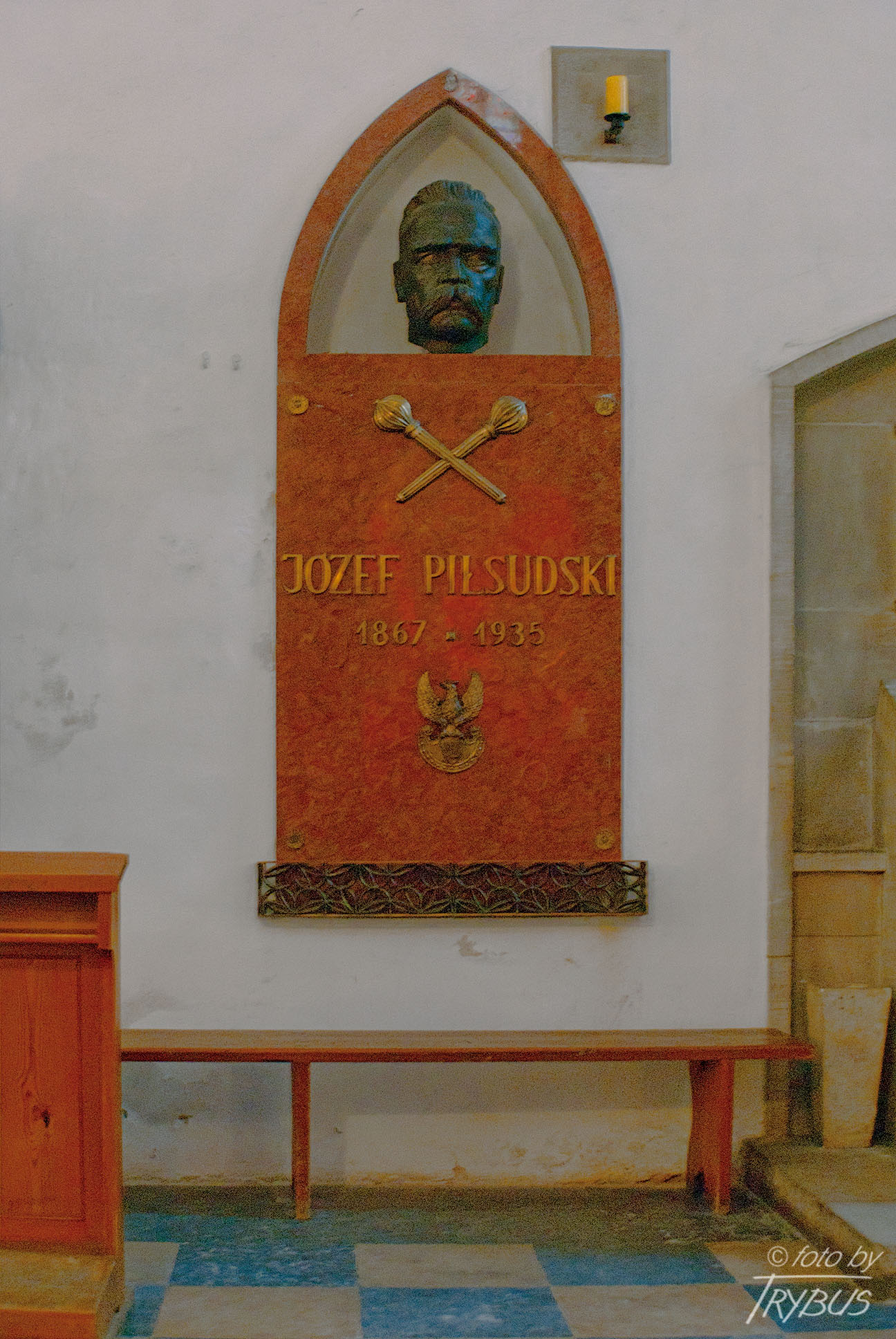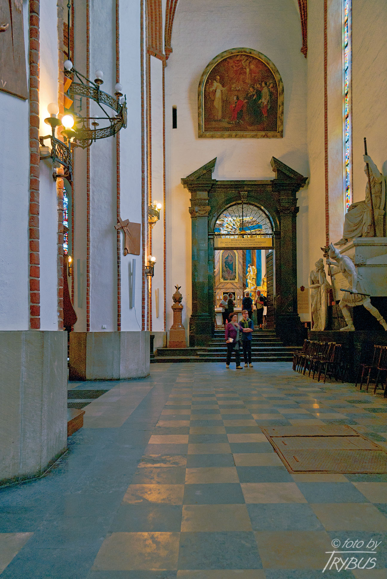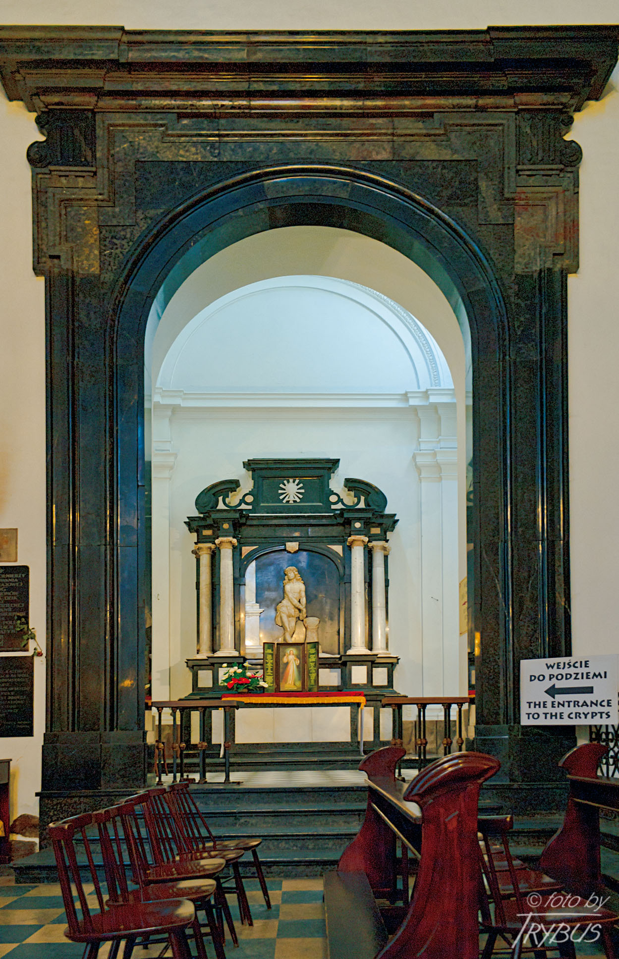Posadzka świątyni wykonana została z czarnego i brązowego marmuru z kamieniołomów w Dębniku i Morawicy.