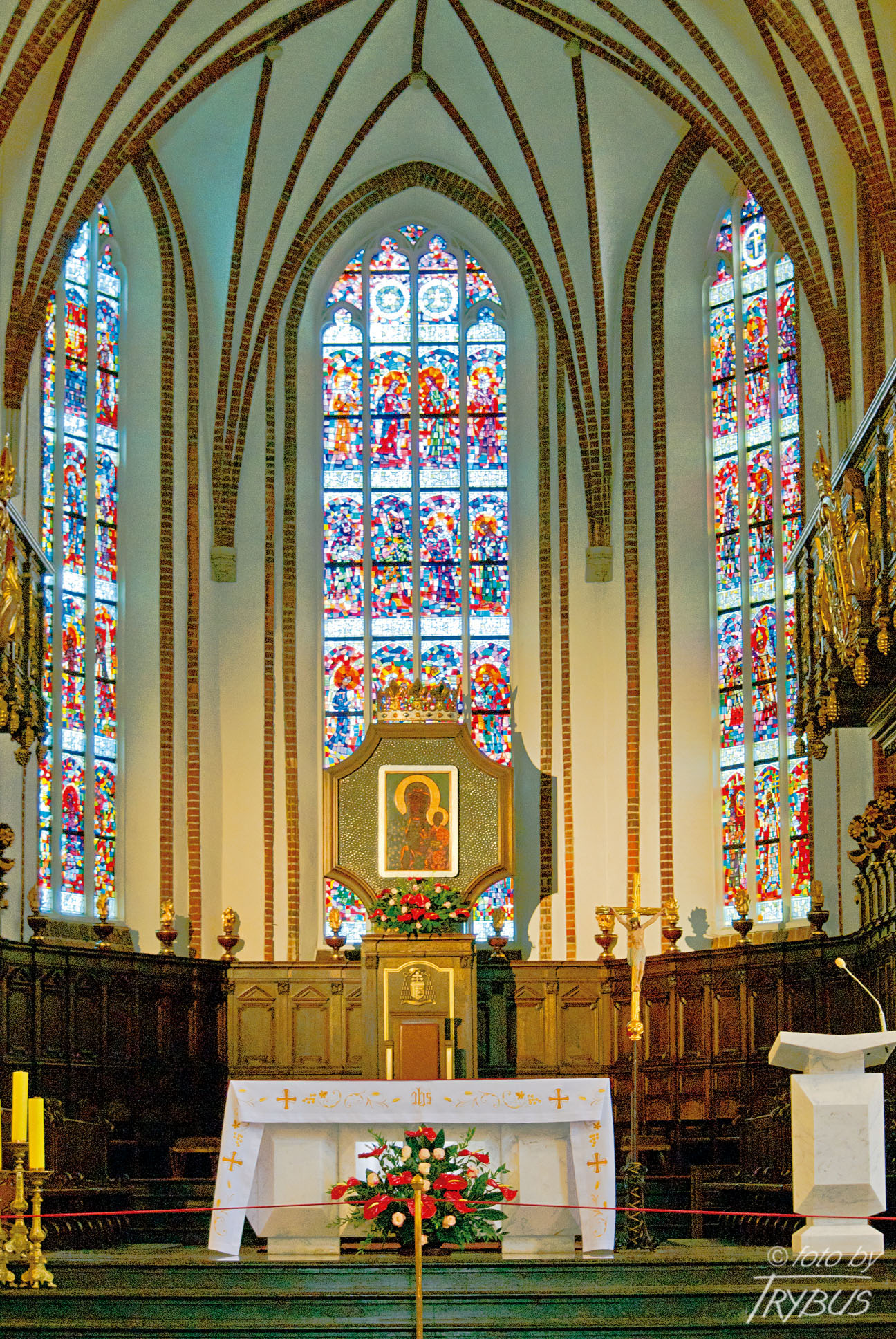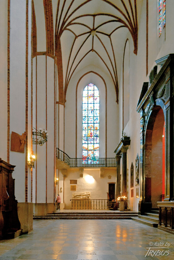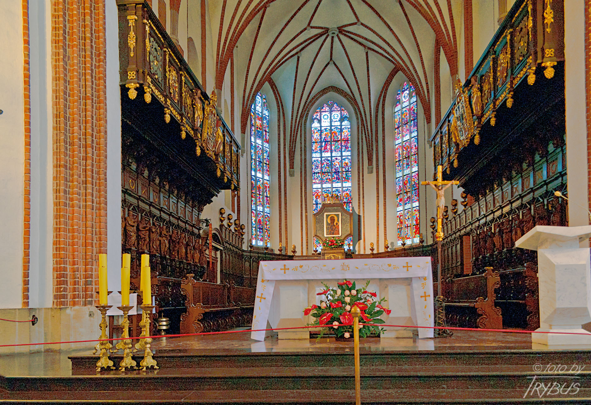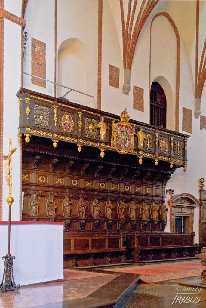 Król Jan II Kazimierz ufundował w prezbiterium dwa chóry, pod którymi następnie król Jan III Sobieski wystawił stalle dla miejscowej kapituły, jako wotum dziękczynne za wiktorię wiedeńską. Zarówno balkony, jak również stalle zostały zrekonstruowane podczas odbudowy. W stallach po północnej stronie umieszczono figury apostołów, natomiast po stronie południowej – figury innych świętych.
