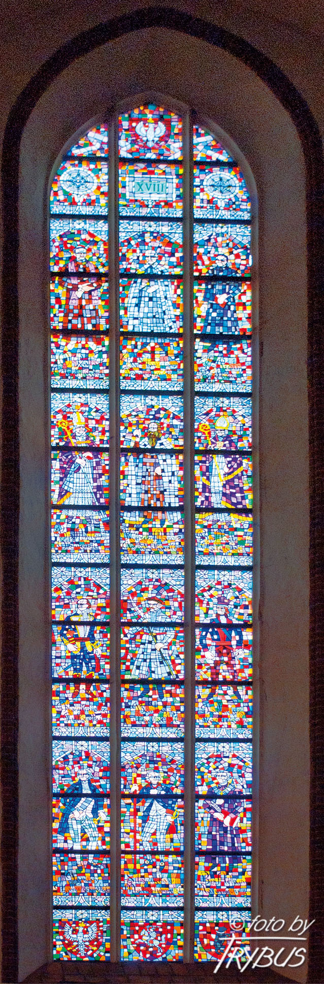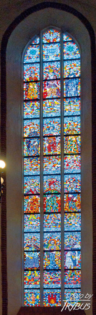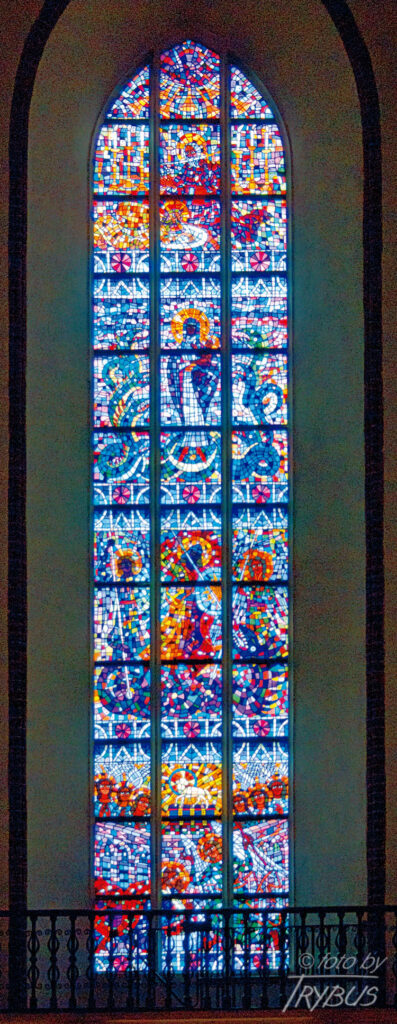 Wysokie, ostrołukowe okna prezbiterium ozdobiono kamiennymi maswerkami. Okna w świątyni zdobią piękne witraże, które są dziełem prof. Wacława Taranczewskiego. Witraże w prezbiterium przedstawiają: życie św. Jana Chrzciciela, postać Najświętszej Marii Panny oraz życie św. Stanisława, a w dodatkowym, małym oknie – 300 rocznicę Ślubów Jasnogórskich. Witraże w południowej nawie ukazują osoby zasłużone dla historii Polski, a w północnej – polskich świętych.
