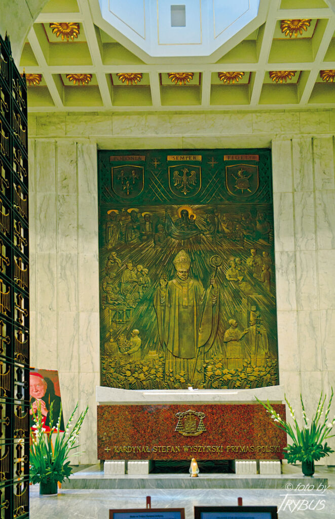 W odbudowanej po wojnie katedrze, w prezbiterium umieszczono Wielki Ołtarz autorstwa Adama Jabłońskiego. W ołtarzu tym znajdowała się kopia obrazu Matki Bożej Częstochowskiej, a na srebrnych blachach przedstawione były tajemnice Różańca Świętego oraz herby archikatedry, kapituły i prymasa Wyszyńskiego. Na początku lat 90. XX wieku, na granicy prezbiterium i nawy ustawiono nowy ołtarz i ambonę z białego marmuru, aby zgodnie z posoborową liturgią, wydobyć ołtarz z głębi prezbiterium. Stara ambona i dotychczasowy ołtarz rozebrano, a w głębi prezbiterium stanął tron biskupi, w zwieńczeniu którego umieszczono obraz Matki Bożej Częstochowskiej, pochodzący z wcześniejszego Wielkiego Ołtarza.
