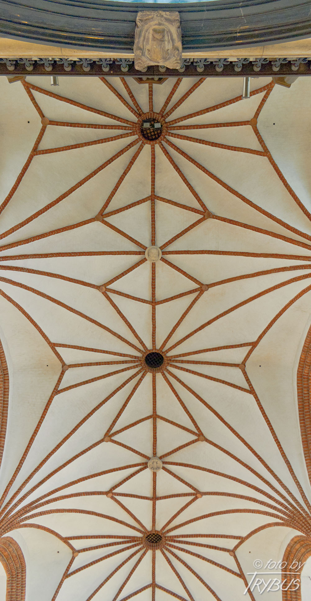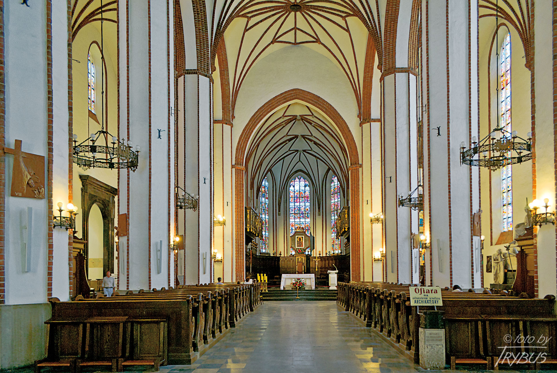 Wnętrze kościoła, wysokie i dość ciemne, przykryte jest sklepieniem gwiaździstym, otynkowanym, z ceglanymi żebrami. Łuki sklepienia spięte są rzeźbionymi w piaskowcu zwornikami, na których umieszczono herby Księstwa Mazowieckiego, Kapituły Archikatedralnej oraz Prymasów Aleksandra Hlonda i Stefana Wyszyńskiego.