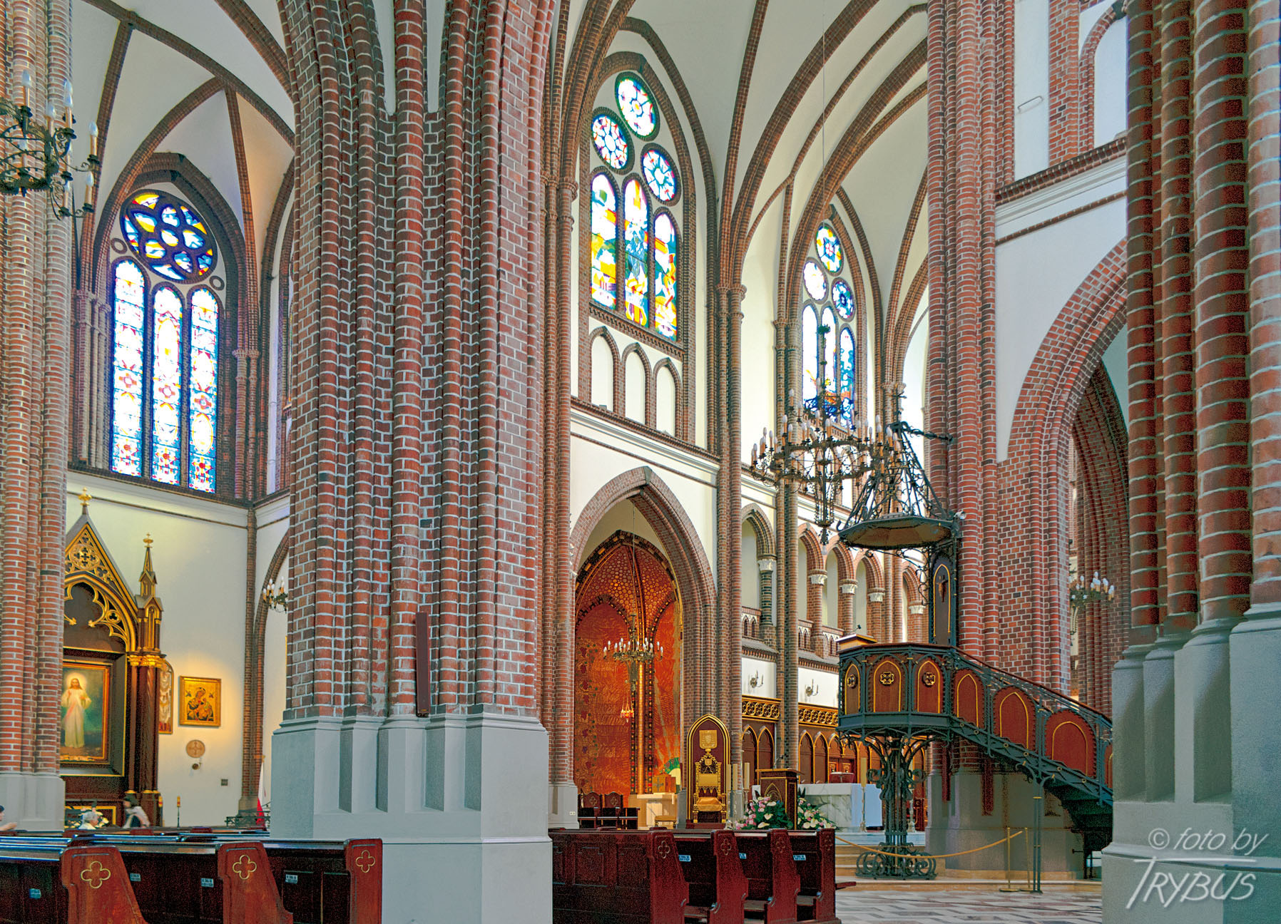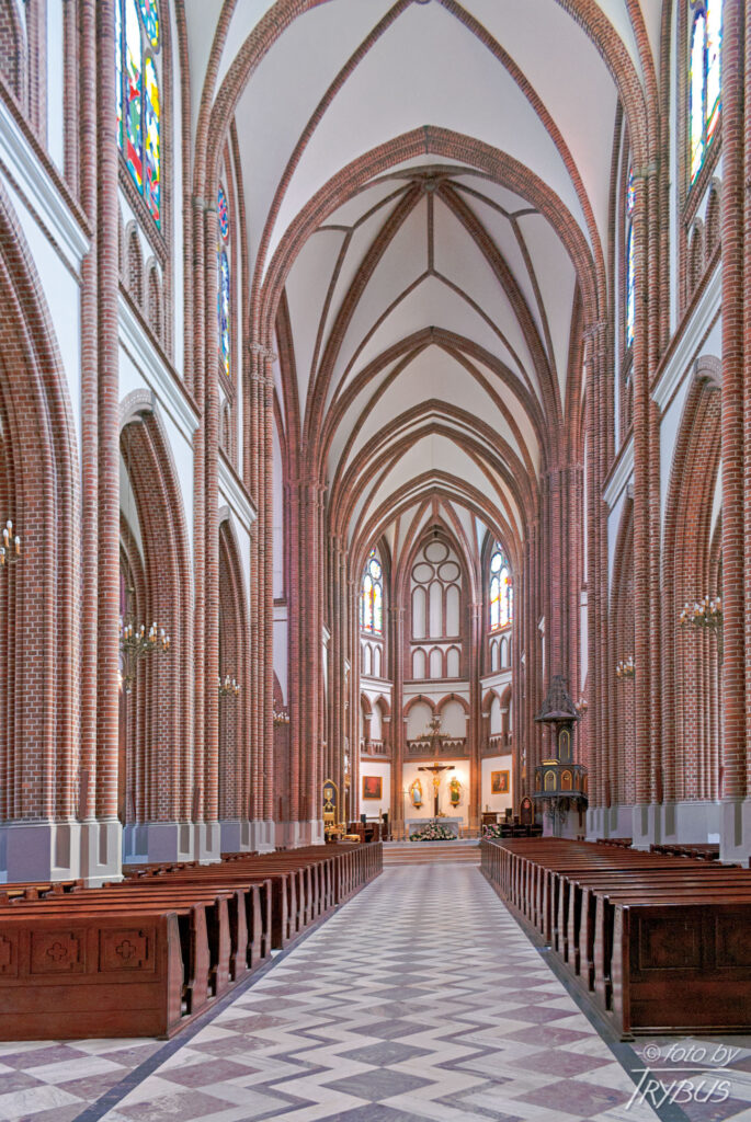 Oryginalne wyposażenie w całości przepadło w 1944 r. Wnętrze również jest ceglane, nieotynkowane. Ołtarz główny świątyni wykonany został w Weronie we Włoszech w 1996 roku, natomiast ołtarze w transepcie są neogotyckie, wykonane przez Jerzego Wrzesińskiego, a obrazy na nich namalowane przez Zofię Grabską. W prawej nawie znajduje się także popiersie Ignacego Kłopotowskiego z zabalsamowanym jego sercem.