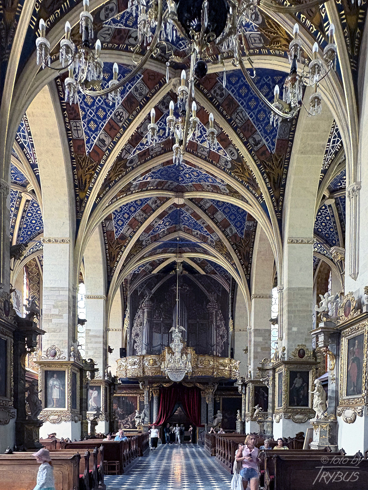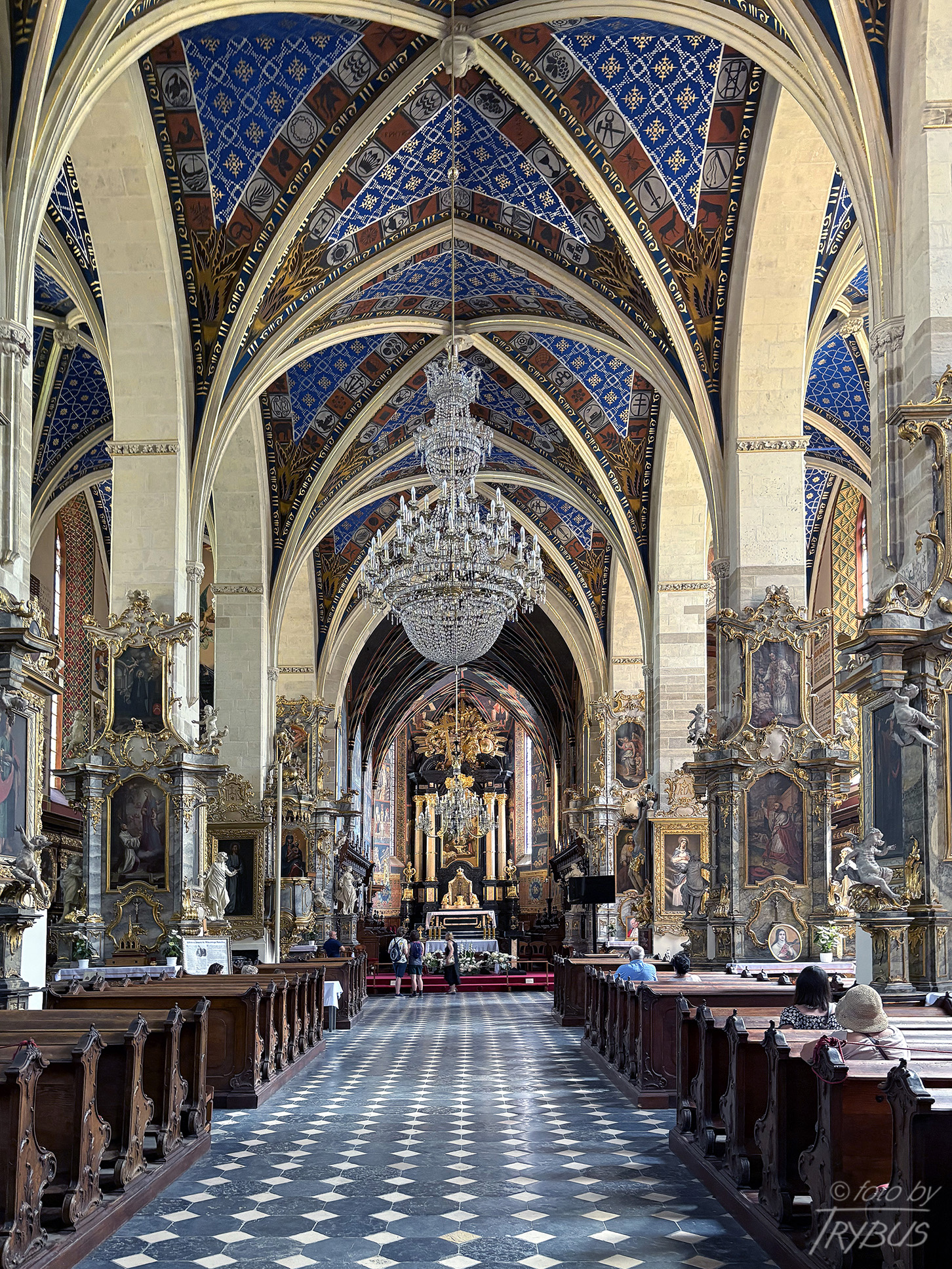 Nawa główna otwarta do naw bocznych ostrołukowymi arkadami wspartymi na czworobocznych filarach. Arkada tęczy również ostrołukowa. Halowe wnętrze przekryte zostało krzyżowo-żebrowym sklepieniem ze zwornikami o heraldycznej dekoracji, której program miał niewątpliwie odzwierciedlać ideę zjednoczonego Królestwa pod berłem króla Kazimierza Wielkiego, fundatora kościoła. Zastosowano także bogatą dekorację roślinną i zwierzęcą fryzów nasad arkad międzynawowych i kapiteli służek.