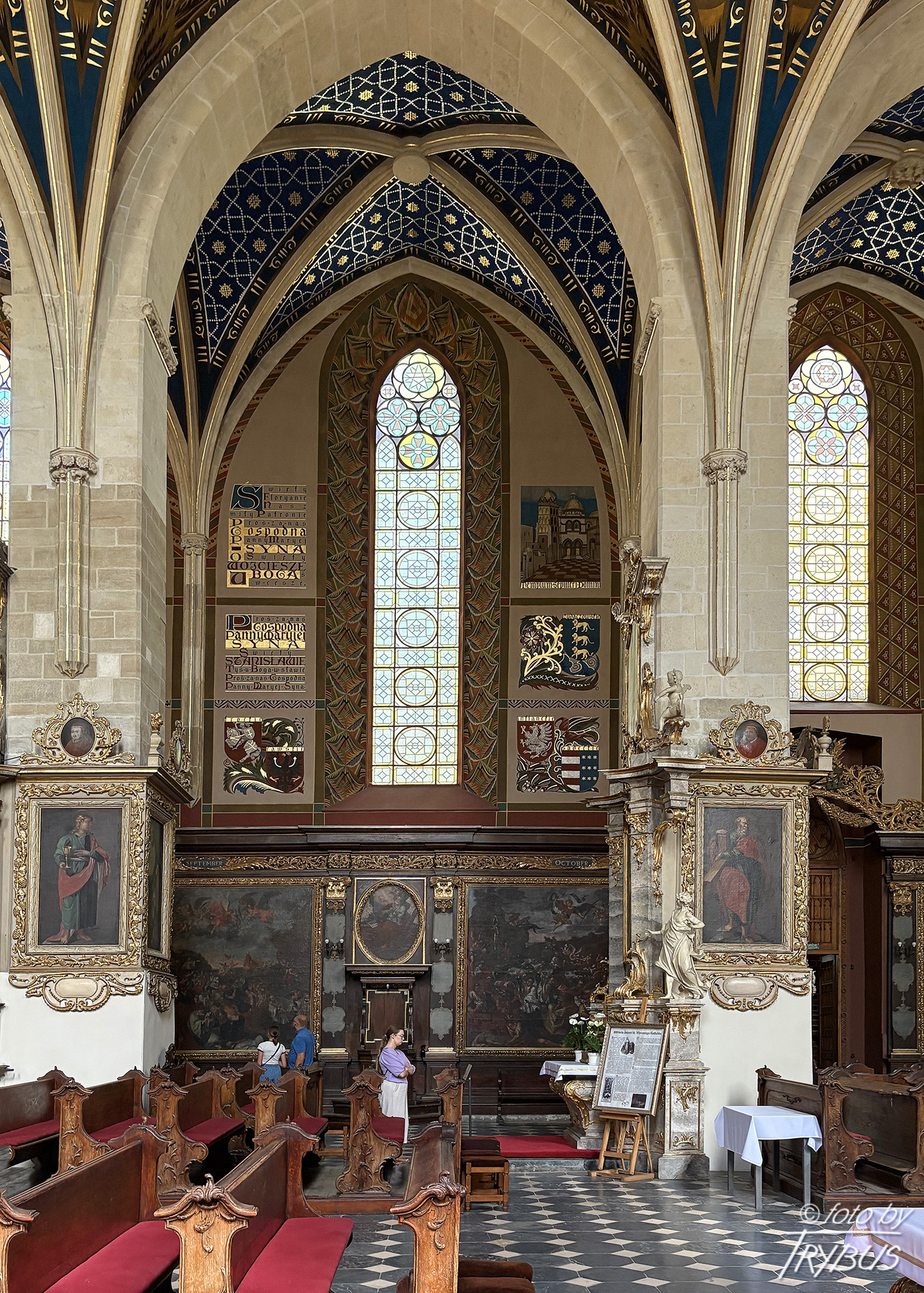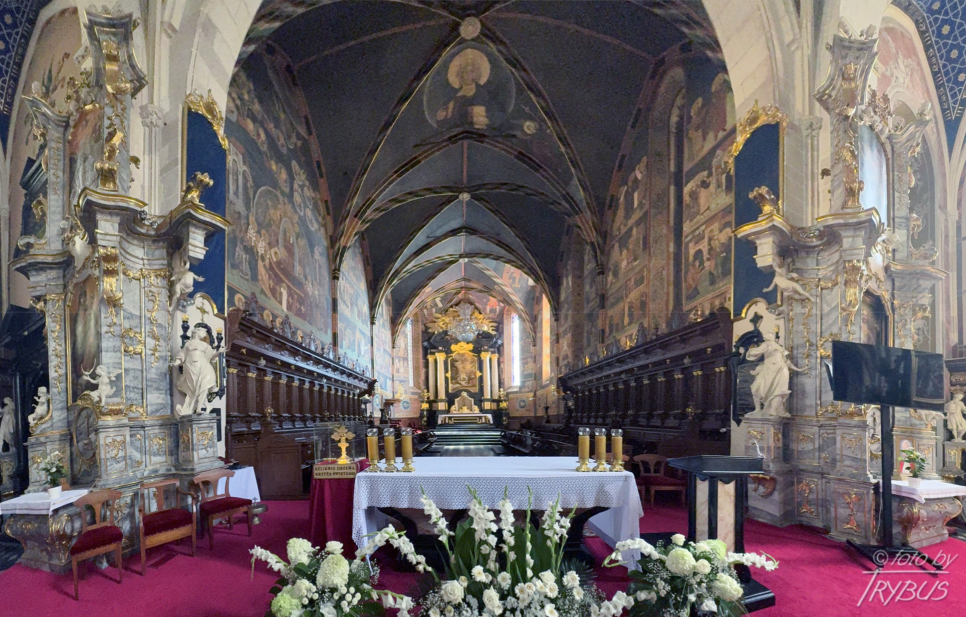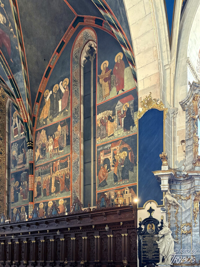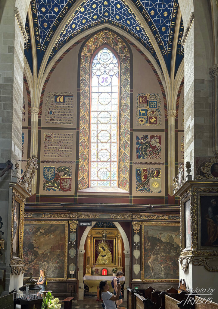 W prezbiterium znajduje się późnobarokowy ołtarz główny z czarnego inkrustowanego marmuru, powstały w 1756 roku z fundacji księdza Stanisława Lipskiego. Wykonał go kamieniarz podkrakowski Tomasz Górecki według rysunków Francesco Placidiego. Cztery masywne kolumny wykonano z białego marmuru. Nad ołtarzem przedstawiono Świętą Trójcę. Obraz w ołtarzu główny przedstawia scenę Narodzenia Marii i jest dziełem dziewiętnastowiecznego malarza Józefa Buchbindera (ucznia Jana Matejki). Ściany boczne i sklepienie prezbiterium pokryte są polichromią o cechach bizantyńsko-ruskich, wykonanymi około 1430 r. przez malarzy włodzimiersko-halickich (powstały w kręgu mecenatu dworskiego króla Władysława II Jagiełły), przemalowanymi w latach 1932-34. Są to jedne z największych i najcenniejszych przykładów tego typu dekoracji w Polsce. W strefowym układzie przedstawione są sceny cyklu maryjnego i chrystologicznego oraz postacie proroków, ewangelistów i świętych. Na sklepieniu widnieje Chrystus na majestacie wśród cherubinów i serafinów. Po bokach prezbiterium znajdują się wczesnobarokowe stalle z około 1640 roku.