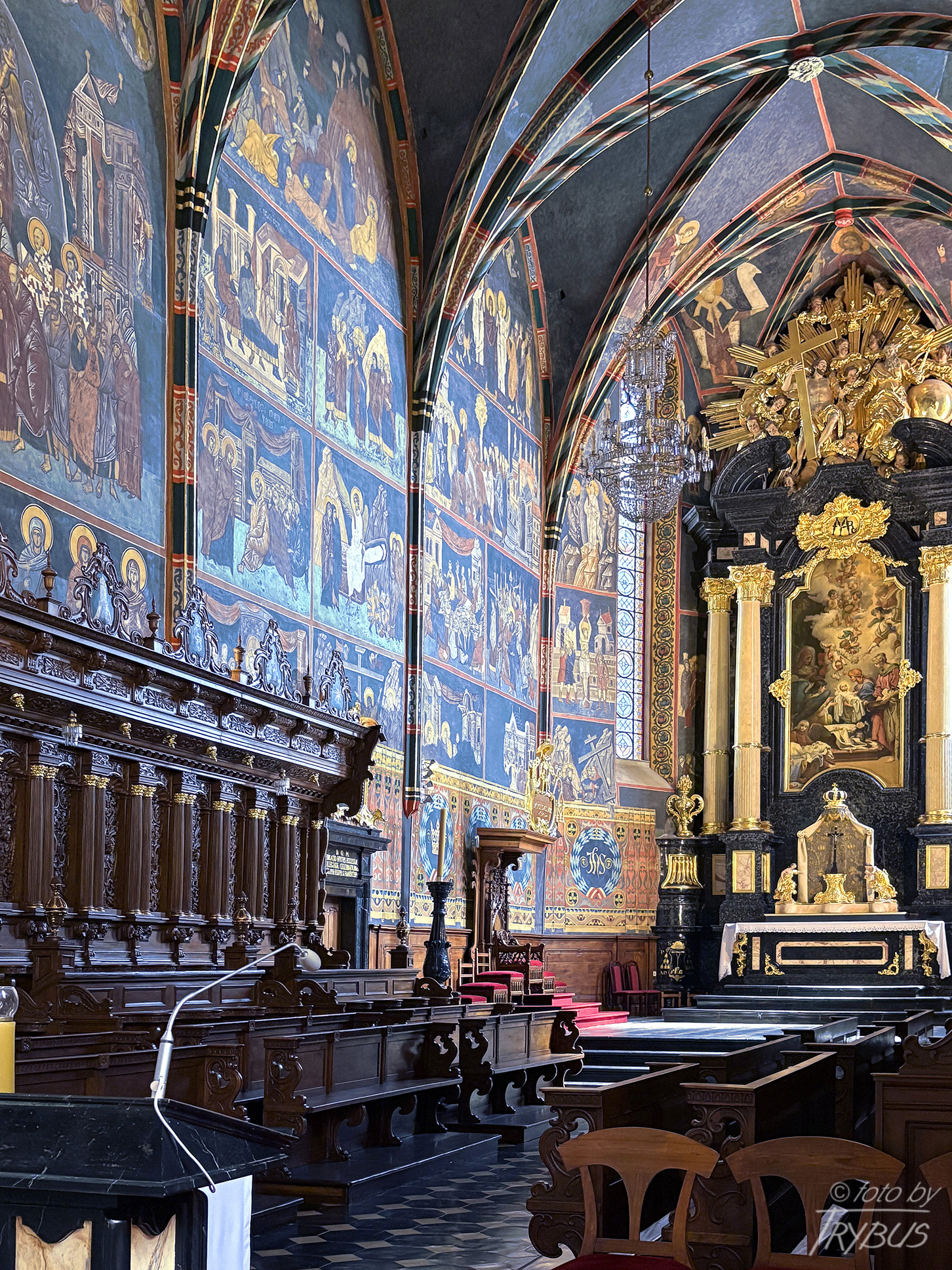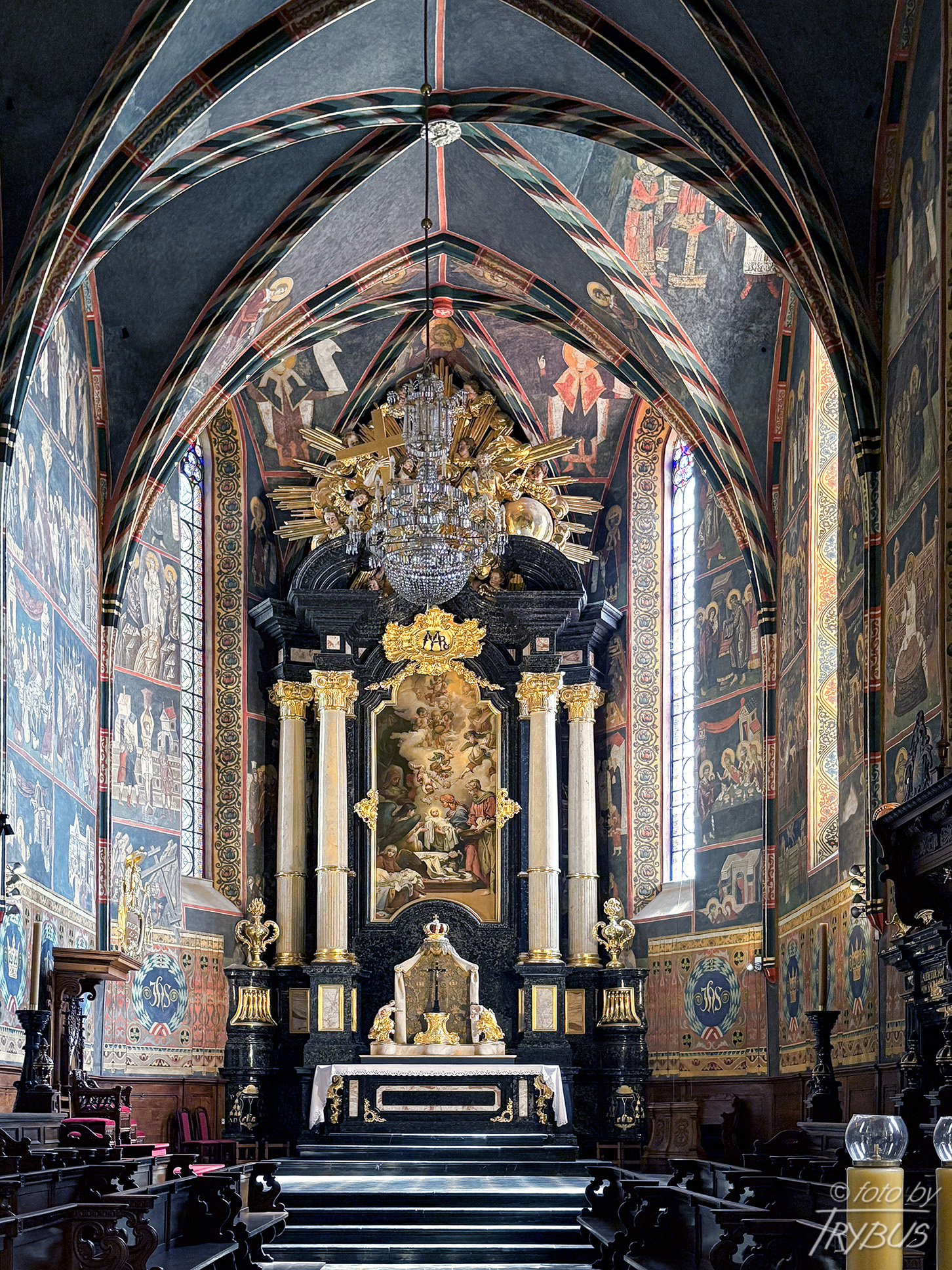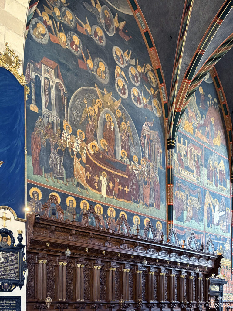W prezbiterium znajduje się późnobarokowy ołtarz główny z czarnego inkrustowanego marmuru, powstały w 1756 roku z fundacji księdza Stanisława Lipskiego. Wykonał go kamieniarz podkrakowski Tomasz Górecki według rysunków Francesco Placidiego. Cztery masywne kolumny wykonano z białego marmuru. Nad ołtarzem przedstawiono Świętą Trójcę. Obraz w ołtarzu główny przedstawia scenę Narodzenia Marii i jest dziełem dziewiętnastowiecznego malarza Józefa Buchbindera (ucznia Jana Matejki). Ściany boczne i sklepienie prezbiterium pokryte są polichromią o cechach bizantyńsko-ruskich, wykonanymi około 1430 r. przez malarzy włodzimiersko-halickich (powstały w kręgu mecenatu dworskiego króla Władysława II Jagiełły), przemalowanymi w latach 1932-34. Są to jedne z największych i najcenniejszych przykładów tego typu dekoracji w Polsce. W strefowym układzie przedstawione są sceny cyklu maryjnego i chrystologicznego oraz postacie proroków, ewangelistów i świętych. Na sklepieniu widnieje Chrystus na majestacie wśród cherubinów i serafinów. Po bokach prezbiterium znajdują się wczesnobarokowe stalle z około 1640 roku.