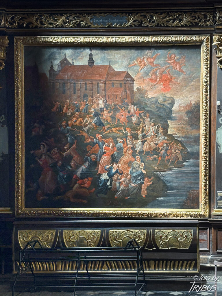 Katedra posiada bogate wyposażenie wnętrza, przeważnie z XVII i XVIII w. Przy tęczy i filarach ustawione jest osiem rokokowych ołtarzy z alegorycznymi kobiecymi posągami wykonanymi w dynamicznych pozach przez Macieja Polejowskiego jednego z najwybitniejszych przedstawicieli lwowskiej rzeźby rokokowej 2. połowy XVIII wieku. Polejowski wykonał też ozdobne ławki i posągi Dawida i św. Cecylii przy filarach chóru muzycznego. Barokowy chór muzyczny i organy wykonane zostały w latach 1694-1697 przez Andrzeja Nitrowskiego z Gdańska i ukończone przez Mateusza Brandtnera z Torunia. Filary międzynawowe obudowane są z trzech stron barokowymi ramami obrazów z 2. połowy XVII w., na których przedstawieni są apostołowie i papieże. Ściany naw bocznych pokrywa boazeria z konfesjonałami z lat 1712-17 rozdzielającymi 12 ram dla cyklu wielkich obrazów, przedstawiających malarską wizję śmierci męczenników kościoła rzymskiego i sandomierskiego. Wczesnorokokowa ambona pochodzi z drugiej połowy XVIII wieku, w zwieńczeniu figura Chrystusa jako Dobrego Pasterza niosącego baranka na ramionach, w glorii na podniebieniu baldachimu gołębica – symbol Ducha Świętego. W nawie kościoła znajduje się też krucyfiks gotycki z 1. połowy XV w. i obraz epitafijny Stanisława Chroberskiego ze sceną Wskrzeszenia Piotrowina z około 1520 r., wykonany w warsztacie krakowskim. W kaplicy Najświętszego Sakramentu przy prezbiterium znajduje się późnobarokowy ołtarz z rzeźbami Wojciecha Rojowskiego.