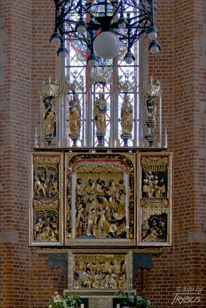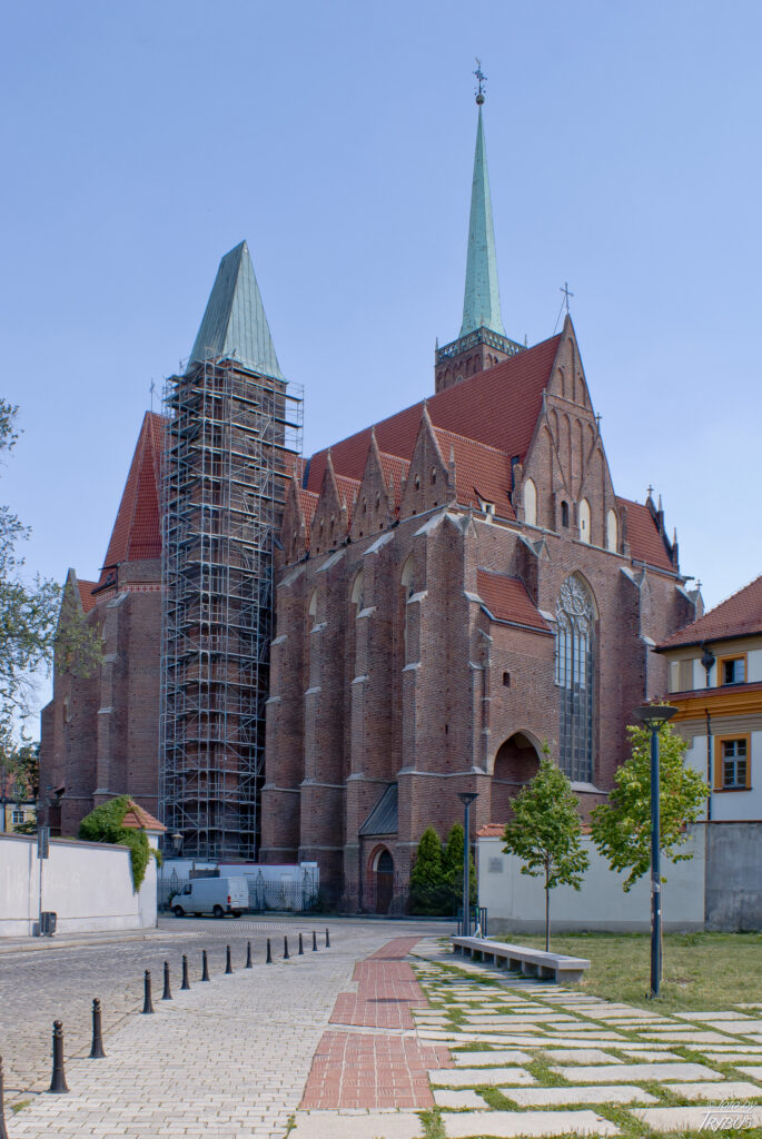 Budowa kościoła początkowo postępowała sprawnie i do 1295 roku zbudowano dwukondygnacyjne prezbiterium, konsekrowane wówczas przez biskupa Jana Romkę. W międzyczasie zmarł książę fundator, którego pochowano w kolegiacie zgodnie z życzeniem wyrażonym w testamencie, choć Henryk chciał by po ukończeniu kościoła klasztornego NMP przeniesiono tam jego zwłoki. Jako, iż jego spadkobierca Henryk głogowski, jeszcze w tym samym 1290 roku, musiał opuścić zamek wrocławski na rzecz Henryka V Grubego, a dwa lata później Wrocław opuściła księżna wdowa Matylda, nie było nikogo zainteresowanego w wykonaniu testamentu i książę pozostał pochowany w prezbiterium kolegiaty.
