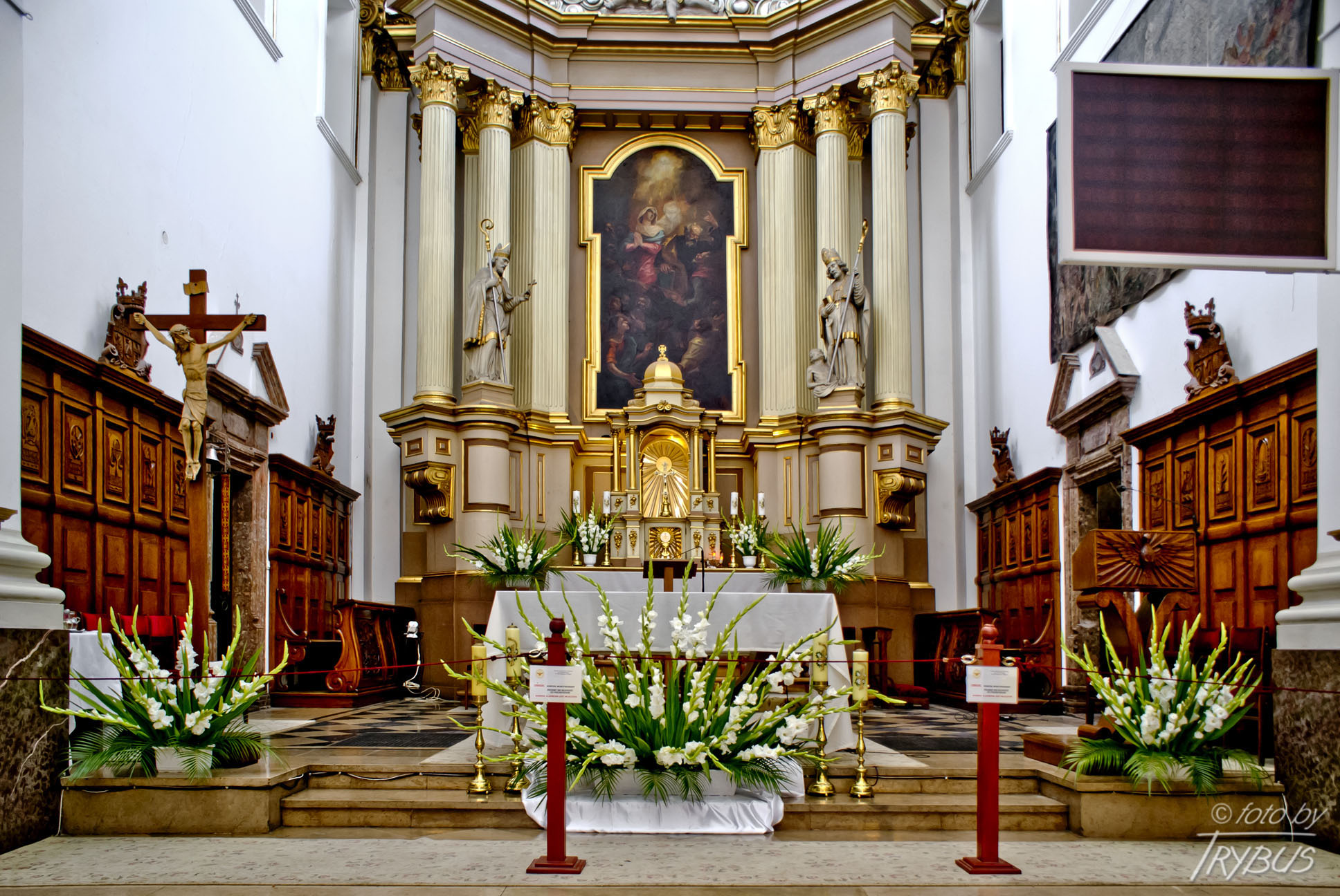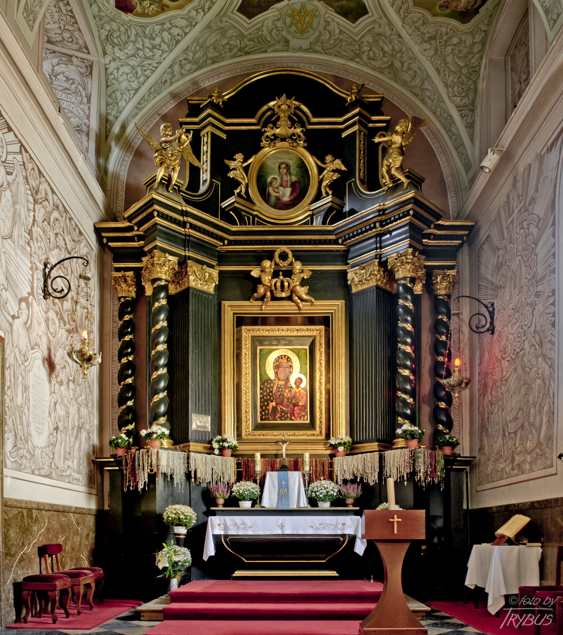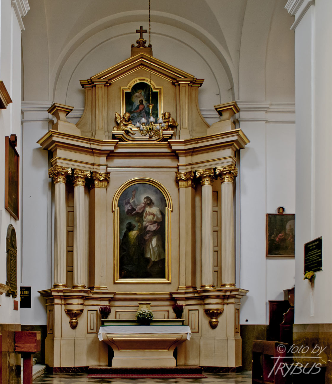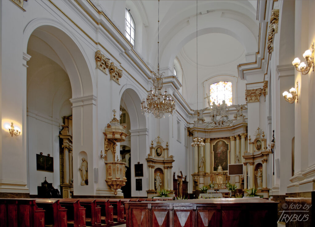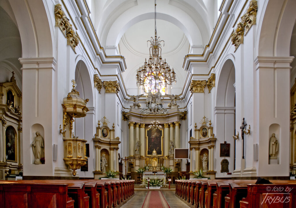 W czasie wojny w 1944 roku wnętrze kościoła uległo zniszczeniu, w związku z tym, ołtarze i ambona są rekonstrukcją zniszczonych sprzętów. Zachowały się tylko epitafia Konstancji Dolfusowej z ok. 1747 r. i Zuzanny Szubskiej z 1776 r. W prezbiterium krata kuta z 1710 roku. Ołtarz św. Antoniego znajdujący się w kruchcie, pochodzi z około połowy XVIII w., przekształcony w drugiej połowie XIX w. z fundacji Konstancji Dulfus. Sprowadzono tu też z Lubiąża dwa obrazy Michaela Willmana Koronowanie cierniem z 1656 r. (w nawie południowej) oraz Podniesienie krzyża z 1661 r. (w nawie północnej). Reszta rzeczy pochodzi z okresu po odbudowie: ołtarz Zesłania Ducha Świętego, i boczne ołtarze Anioła Stróża, św. Tomasza, św. Józefa Oblubieńca, Serca Pana Jezusa, św. Agnieszki, św. Tomasza Judy, MB Częstochowskiej (w kaplicy) i ambonę wykonał paulin Bronisław Hoffman, a większość obrazów wykonał Leonard Torwirt.