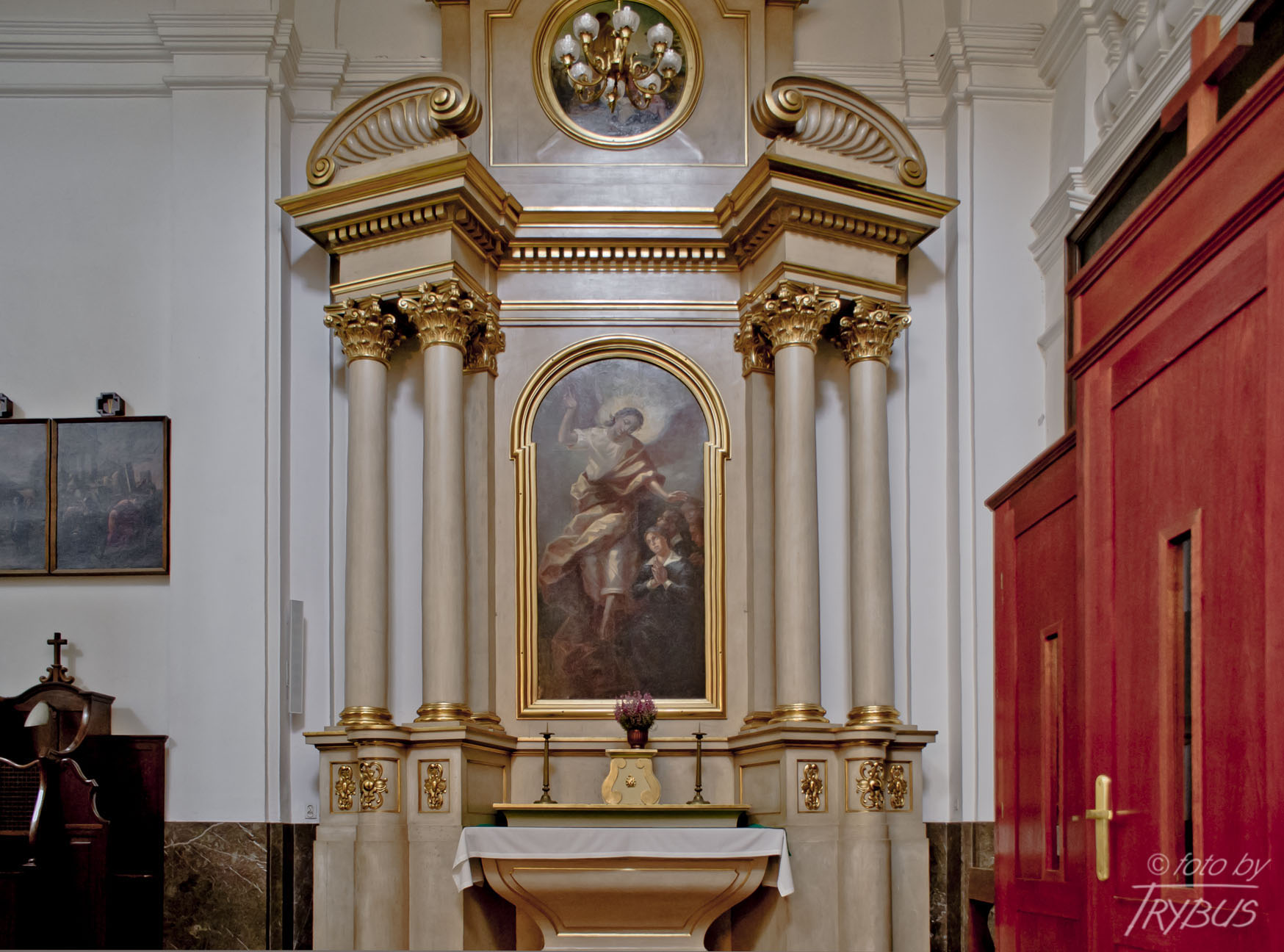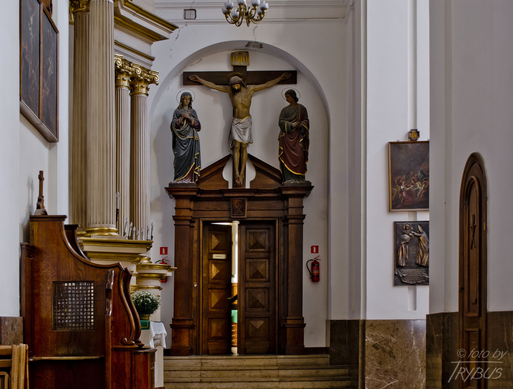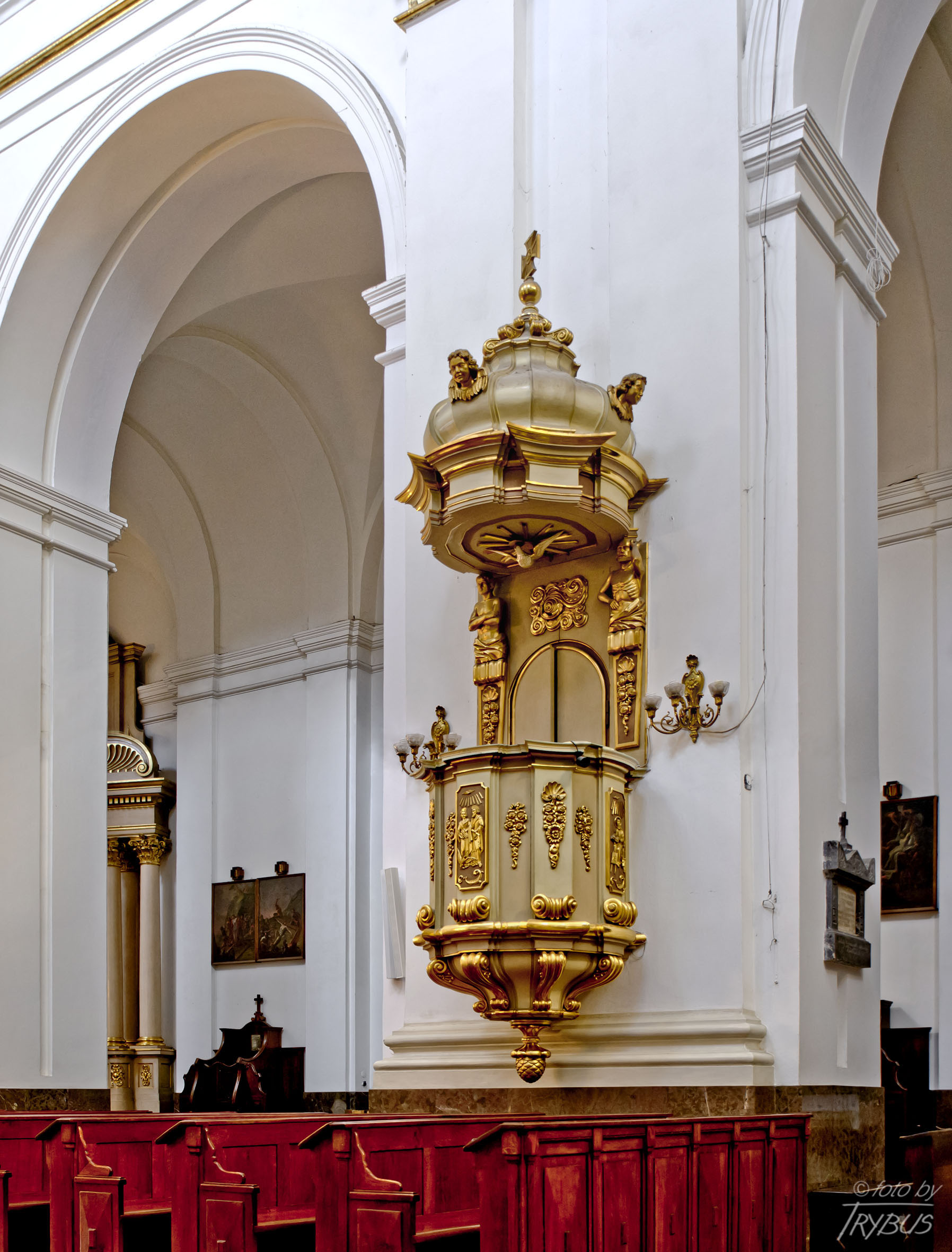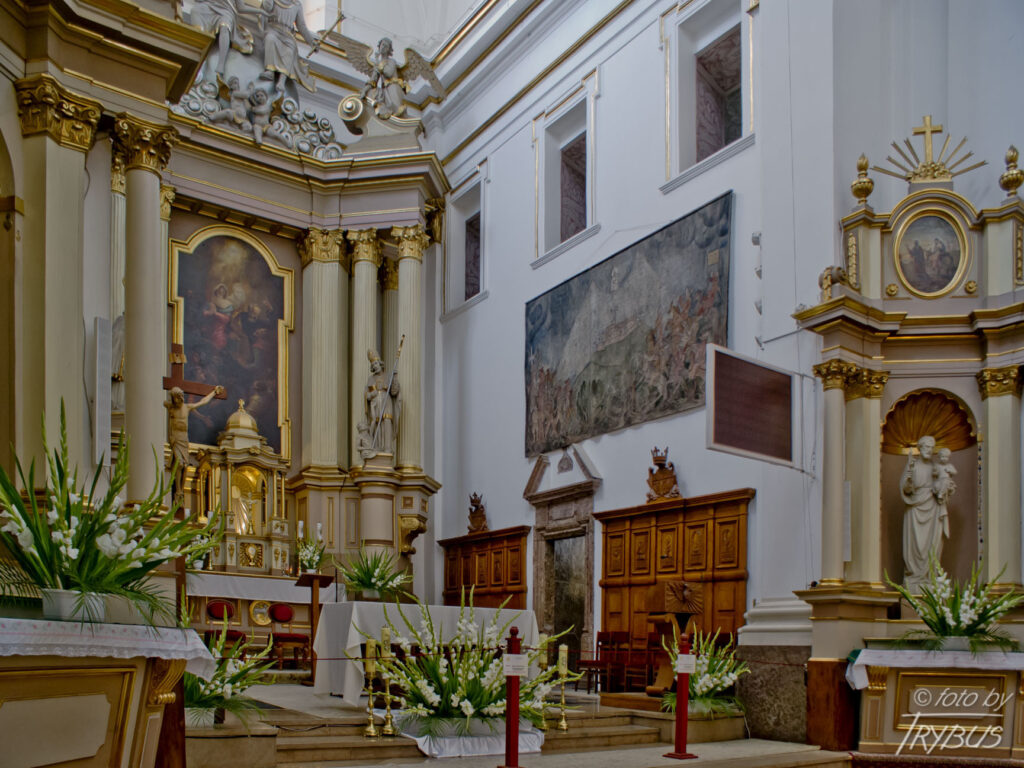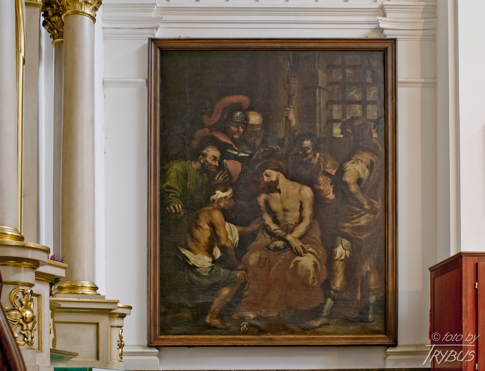 W czasie wojny w 1944 roku wnętrze kościoła uległo zniszczeniu, w związku z tym, ołtarze i ambona są rekonstrukcją zniszczonych sprzętów. Zachowały się tylko epitafia Konstancji Dolfusowej z ok. 1747 r. i Zuzanny Szubskiej z 1776 r. W prezbiterium krata kuta z 1710 roku. Ołtarz św. Antoniego znajdujący się w kruchcie, pochodzi z około połowy XVIII w., przekształcony w drugiej połowie XIX w. z fundacji Konstancji Dulfus. Sprowadzono tu też z Lubiąża dwa obrazy Michaela Willmana Koronowanie cierniem z 1656 r. (w nawie południowej) oraz Podniesienie krzyża z 1661 r. (w nawie północnej). Reszta rzeczy pochodzi z okresu po odbudowie: ołtarz Zesłania Ducha Świętego, i boczne ołtarze Anioła Stróża, św. Tomasza, św. Józefa Oblubieńca, Serca Pana Jezusa, św. Agnieszki, św. Tomasza Judy, MB Częstochowskiej (w kaplicy) i ambonę wykonał paulin Bronisław Hoffman, a większość obrazów wykonał Leonard Torwirt.