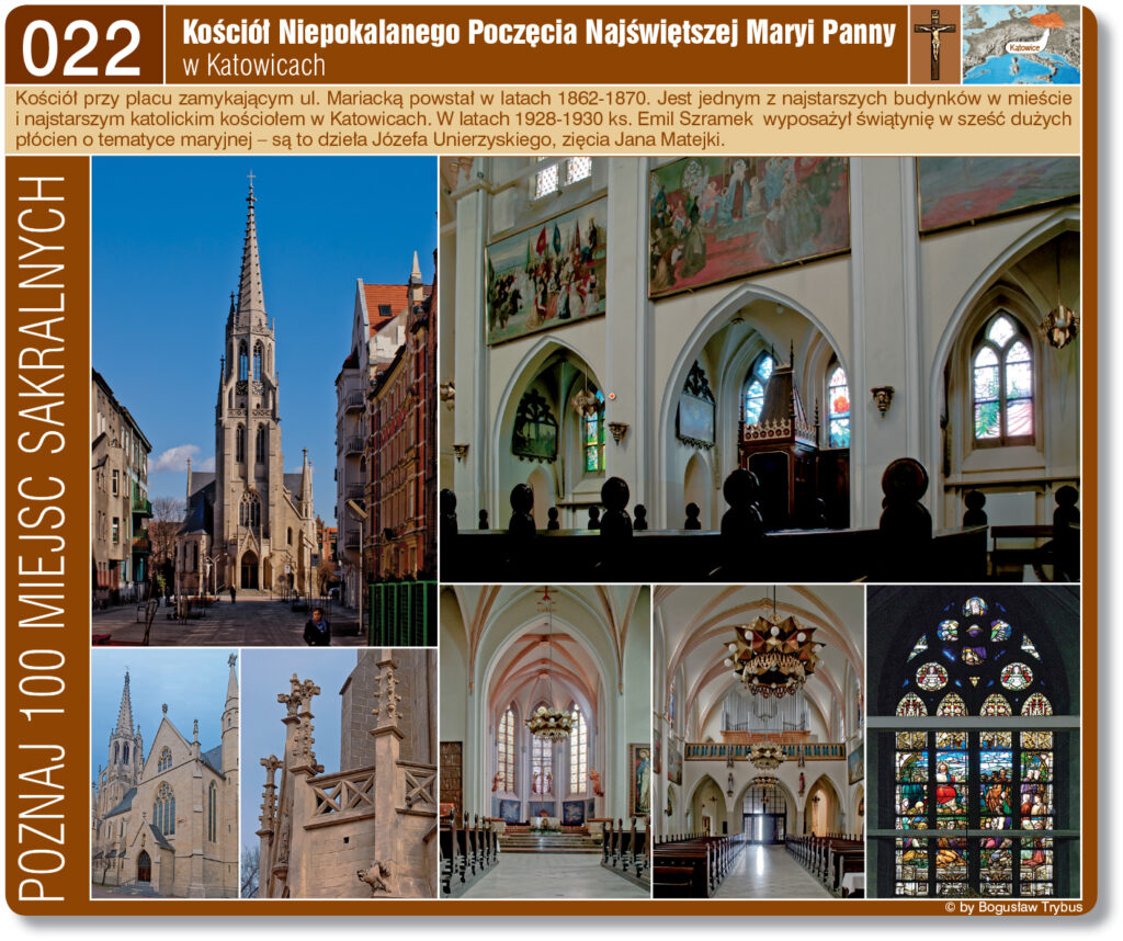 Kościół Niepokalanego Poczęcia Najświętszej Maryi Panny w Katowicach zwany jest też kościołem mariackim. Zaprojektowany został przez XIX-wiecznego wrocławskiego architekta Alexisa Langera jest wybitnym przykładem świątyni neogotyckiej, bogato dekorowanej, prezentującej wysoki poziom artystyczny. Wysoka wieża wznosi się na wysokość 71 metrów. Długość nawy wynosi 43 metry, a szerokość w transepcie 31 metrów.