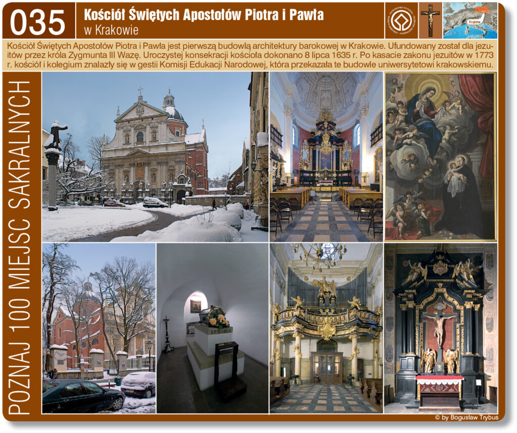 Kościół Świętych Apostołów Piotra i Pawła w Krakowie jest doskonałym przykładem architektury nawiązującej do rzymskiego kościoła Il Gesu, który został wzniesiony w 2. połowie XVI wieku przez zakonu jezuitów – stał się wzorem dla wielu późniejszych kościołów barokowych. Krakowski kościół ukończono w 1619 roku, a plany kościoła wykonał Giovanni de Rossis, naczelny architekt zakonu jezuitów w Rzymie.