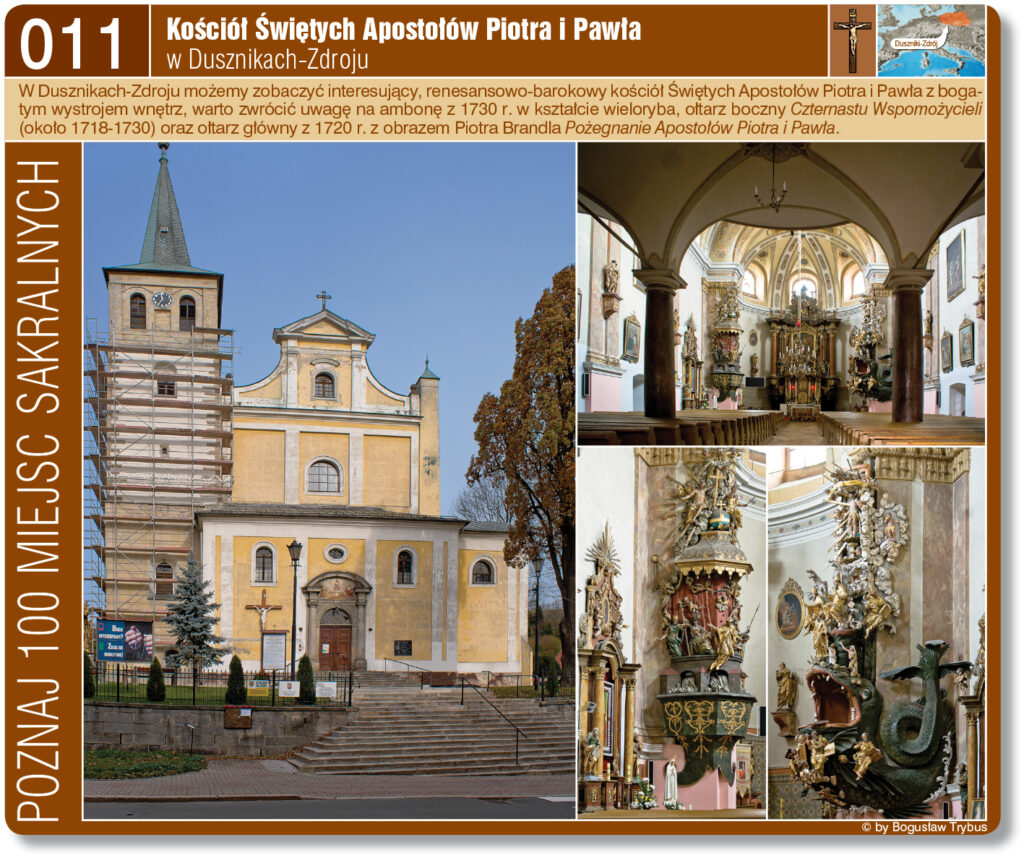 Kościół Świętych Apostołów Piotra i Pawła w Dusznikach-Zdroju, wybudowany został w latach 1708–1730, częściowo na miejscu starszej świątyni. Wyposażenie kościoła jest głównie barokowe, a szczególnie ambona w formie wieloryba i ołtarz boczny Czternastu Wspomożycieli mają wybitne wartości artystyczne. Ołtarz główny i ambona w formie wieloryba to dzieła autorstwa kłodzkiego rzeźbiarza Michaela Kösslera.