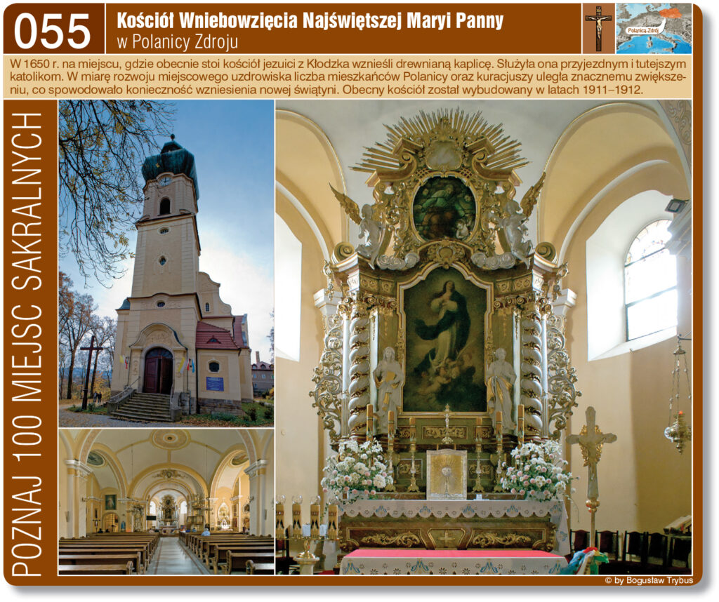 Do uzdrowiska Polanica-Zdrój można dojechać samochodem, autobusem (są połączenia bezpośrednio z kilku większych miast w Polsce) jak i koleją. Tu z reguły najpierw trzeba dotrzeć do Wrocławia, a stamtąd pociągiem na Kudowę-Zdrój – do Polanicy jedzie tak około 2 godzin. Dojście z dworca kolejowego do centrum uzdrowiska, zajmie niecałe 15 minut, natomiast od dworca autobusowego jest bliżej. Kościół Wniebowzięcia Najświętszej Maryi Panny góruje nad uzdrowiskowym deptakiem, na wschodnim brzegu Bystrzycy Dusznickiej