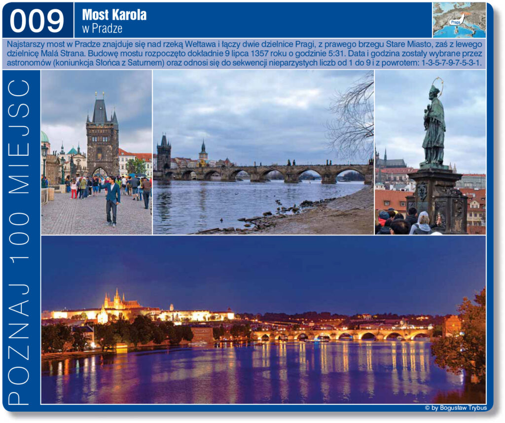 Kamień węgielny nowego kamiennego mostu wmurował Karol IV Luksemburski 9 lipca 1357 o godzinie 5:31 rano. Data i godzina zostały wybrane przez astronomów (koniunkcja Słońca z Saturnem) oraz odnosi się do sekwencji nieparzystych liczb od 1 do 9 i z powrotem: 1-3-5-7-9-7-5-3-1 (jest ona palindromem – czytana z obydwu stron brzmi tak samo). Figura św. Jana Nepomucena według legendy przynosi szczęście. Należy dotknąć płaskorzeźby, znajdującej się pod posągiem. Dlatego też, ta wypolerowana część, świeci złocistym mosiądzem.