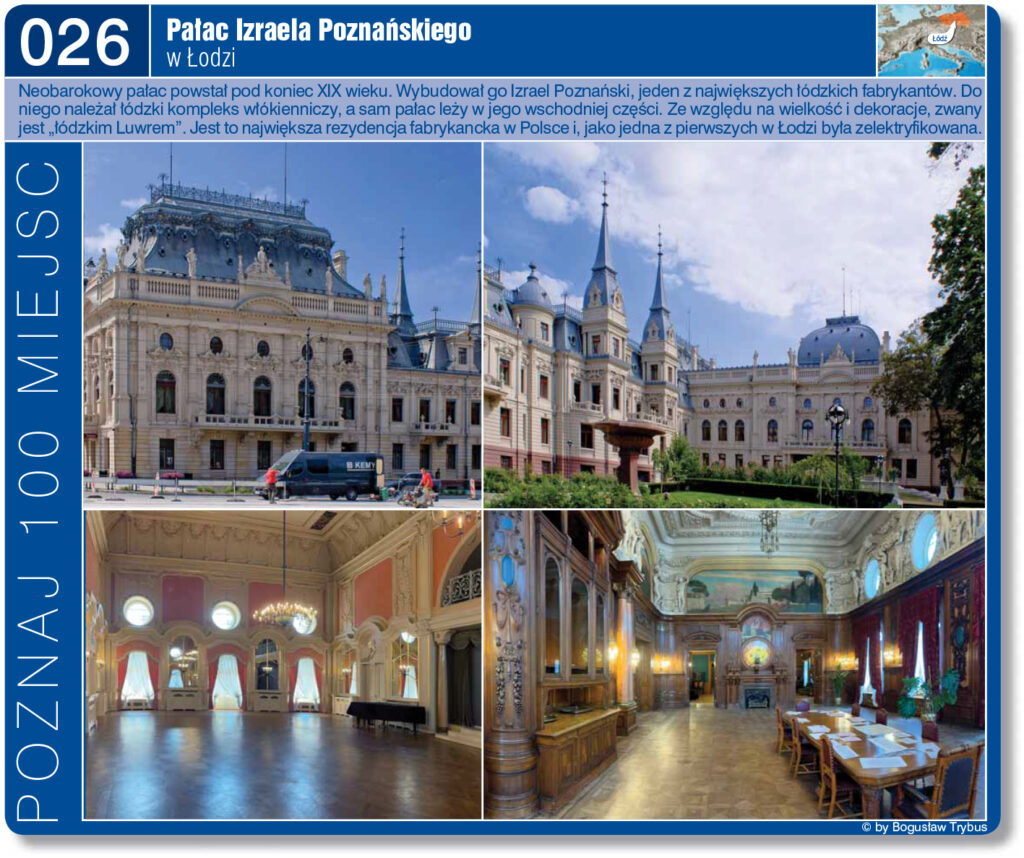 Pałac Izraela Poznańskiego znajduje się po wschodniej stronie fabryki włókienniczej Izraela Poznańskiego. Teren pod swoją rezydencję Izrael Poznański nabył 6 lat, po zakupie działki na fabrykę, w 1877 roku. Powstał neobarokowy pałac fabrykancki, który ze względu na wielkość i dekoracje, nazwany jest „łódzkim Luwrem”.