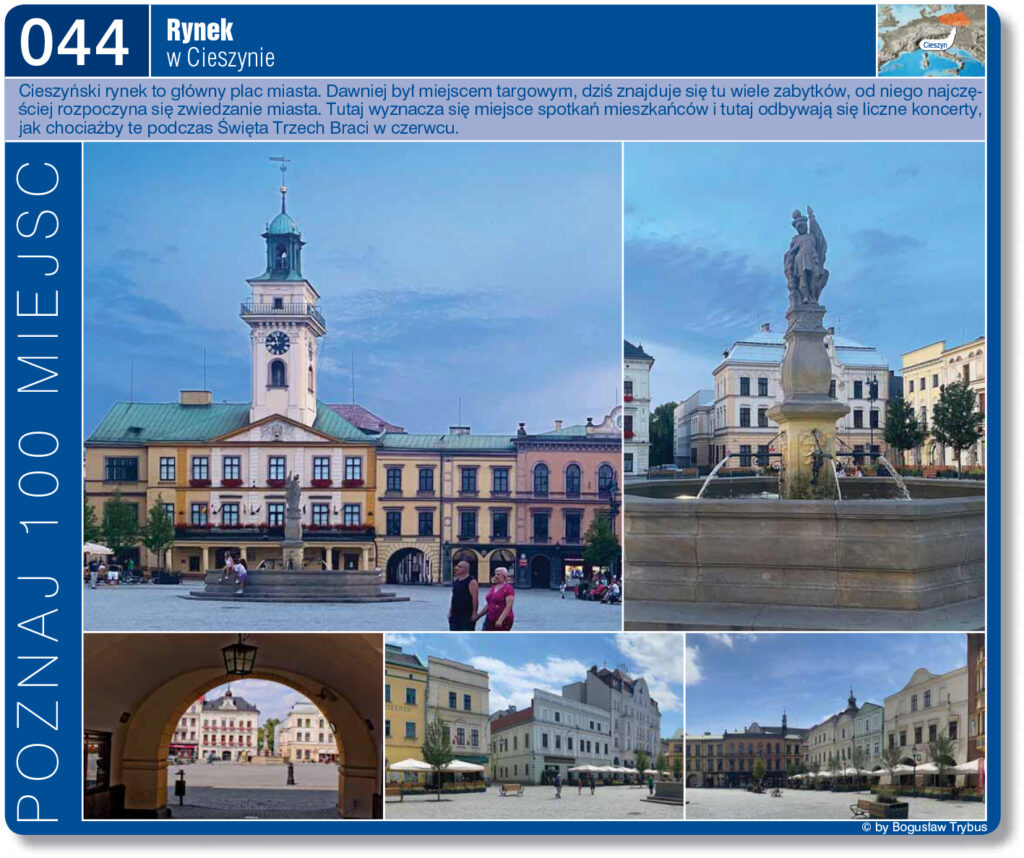 Rynek w Cieszynie w obecnej formie powstał pod koniec XV stulecia i zachował typowy układ przestrzenny, z szerokimi sieniami, dekorowanymi sklepieniami kolebkowymi z lunetami, kamiennymi portalami oraz stropami belkowymi. Pośrodku placu stoi barokowa studnia z figurą św. Floriana.