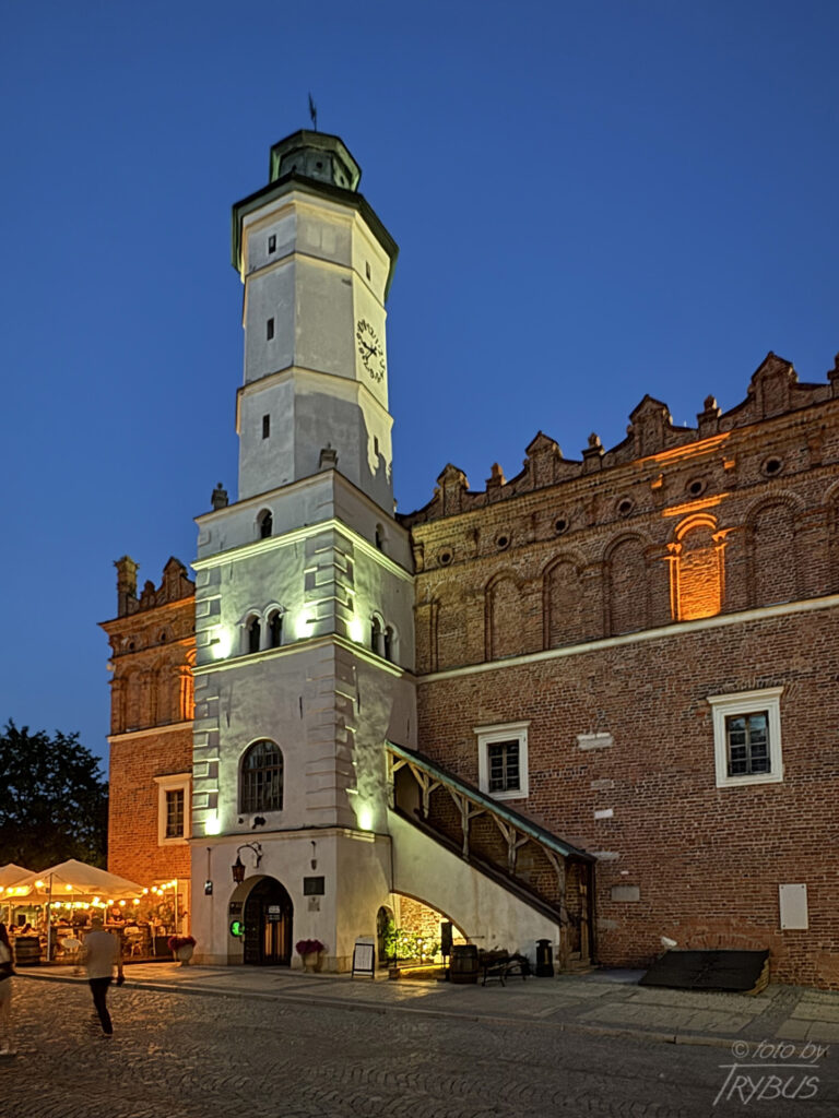 Ratusz pochodzi z przełomu XIV-XV wieku, dlatego też, choć sama bryła jest renesansowa, można się w nim dopatrzyć pewnych elementów typowych dla gotyckich budowli. Charakterystyczna attyka natomiast powstała w szesnastym wieku. W kolejnym stuleciu powstała wieża, czworoboczna do wysokości korpusu ratusza, wyżej ośmiokątna, zwieńczona hełmem. Druga kondygnacja wieży dostępna jest dzięki drewnianym schodom z zadaszeniem, przystawionym do ściany ratusza. Pod schodami znajduje się zejście do piwnic. Elewacje zwieńczone są attyką o trzystrefowym układzie. Dolna, najwyższa, rozczłonkowana jest ślepymi arkadami, wyższa zdobiona esownicowymi konsolkami na przemian z kolistymi wywietrznikami a najozdobniejsze, najwyższe partie attyki, złożone są z przemiennie wyższych i niższych cokołów, powiązanych esownicami. W narożnikach strefy dolnej zwracają uwagę cztery głowy, podobno symbolizujące cztery stany, duchowny, rycerski, mieszczański i włościański, a na wydatnym gzymsie umieszczono półpostaci zwierząt, zapewne lwów. Na ścianie południowej ratusza znajduje się zegar słoneczny wykonany w technice sgraffito przez Tadeusza Przypkowskiego (1958). W pomieszczeniach piwnicznych, z których najstarsze jest wnętrze południowe, znajdują się obecnie pomieszczenia klubowe z kawiarnią. Na pierwszym piętrze mieszczą się dwie sale: w pierwszej obradują radni Rady Miasta Sandomierz, w drugiej odbywają się śluby cywilne. W części attyki, na poddaszu są biura Urzędu Stanu Cywilnego.