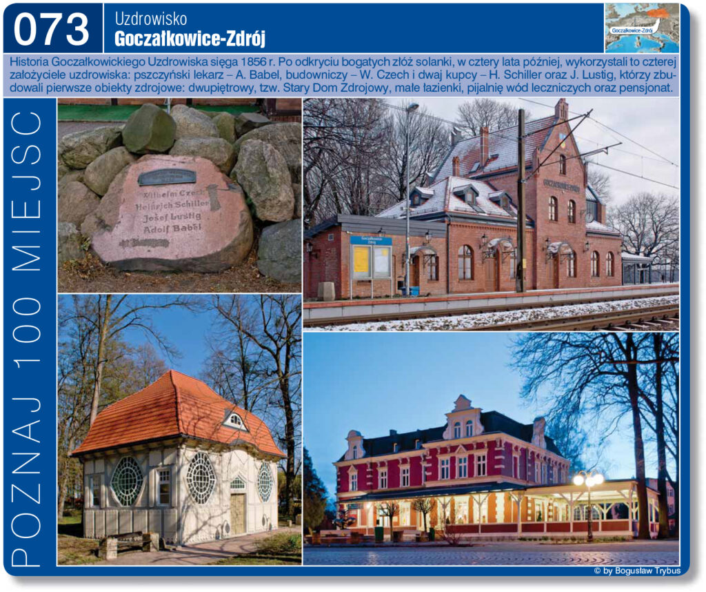 Można powiedzieć, że Goczałkowice-Zdrój zostały uzdrowiskiem przez przypadek. W 1856 roku władze pruskie poszukiwały na terenie miejscowości pokładów soli. Na głębokości 616 m natrafiono na 4% solankę. Okazało się, że założenie wytwórni soli jest nieopłacalne. Dlatego w roku 1861 rząd wystawił odwiert na sprzedaż wraz z okolicznymi zabudowaniami. Teren zakupiła spółka Adolfa Babela pszczyńskiego lekarza, Heinricha Schillera kupca i Wilhelma Czecha mistrza budowlanego. Nabywcy zlecili chemiczną analizę wód dr. Szwarcowi z Wrocławia. Wyniki analizy postawiły wody goczałkowickie na równi z ówczesnymi sławnymi źródłami w Kreutznachu, w Krankenheil, w austriackim Hall i bawarskim Adelheids-Quelle. W 1862 roku rozpoczął się I sezon kuracyjny. W tymże roku Goczałkowice odwiedziło 262 kuracjuszy, zaś w 1895 roku – korzystało z kurortu już 1841 osób.