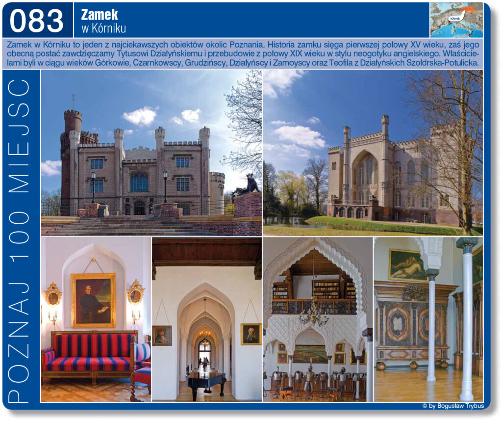 Kórnik to jeden z tych zamków, które trzeba zobaczyć obowiązkowo. Położony jest przy Jeziorze Kórnickim i otoczony wciąż nawodnioną fosą. Początki zamku sięgają średniowiecza, a jego obecny kształt pochodzi z połowy XIX wieku, nadano mu wtedy charakter neogotyku angielskiego. W smukłej sylwetce budowli odnajdziemy bogactwo różnych elementów architektonicznych jak wieże, wieżyczki, ryzality, loggie, wykusze, strzelnice i wiele dekoracyjnych detali