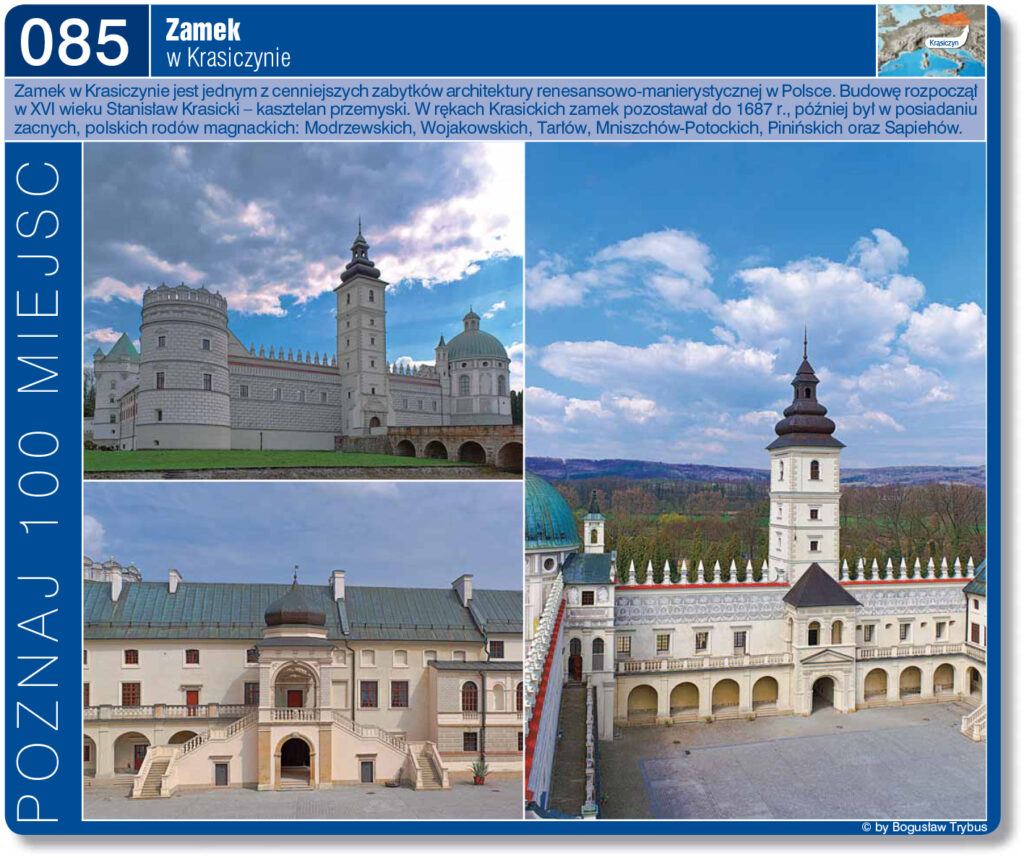 Zamek w Krasiczynie jest perłą architektury renesansowo-manierystycznej w Polsce, wyróżniającym się wysokiej klasy formą architektoniczną z charakterystycznymi basztami i attykowymi zwieńczeniami oraz bogactwem wystroju elewacji. Architektura zamku oraz dekoracje skomponowane zostały w myśl programu ideowego, symbolizującego m.in. „odwieczny porządek społeczny”. Znalazł on odbicie w nazwach i częściowo w formach czterech narożnych baszt: Boskiej, Królewskiej, Papieskiej i Szlacheckiej.