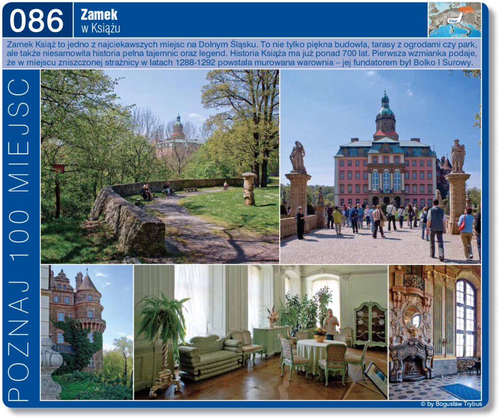Zamek w Książu usytuowany na wysokim skalistym urwisku, z trzech stron otoczony głębokim, zalesionym jarem, góruje majestatycznie nad całą okolicą sprawiając zaiste baśniowe wrażenie. W wyniku prowadzonej od kilku dekad i wciąż kontynuowanej renowacji zdewastowany w latach 40. XX wieku zamek w znacznej części odzyskał blask pozwalający wyobrazić sobie, jak prezentował się w okresie największej świetności rodu von Hochberg, gdy odwiedzały go koronowane głowy i wielcy politycy. Dziś siedzibę mają tutaj: muzeum, centrum-konferencyjne, restauracja oraz hotel. Do Zamku wchodzi się poprzez budynek bramny (z lat 1718–1719), następnie ciągiem oficyn (z lat 1722–1724) przechodzi się mostem na Dziedziniec Honorowy. Most flankowanym jest rzeźbami lwów trzymających kartusze herbowe, dziedziniec otaczają kamienne balustrady z latarniami i figurami stylizowanymi na postacie alegoryczne.